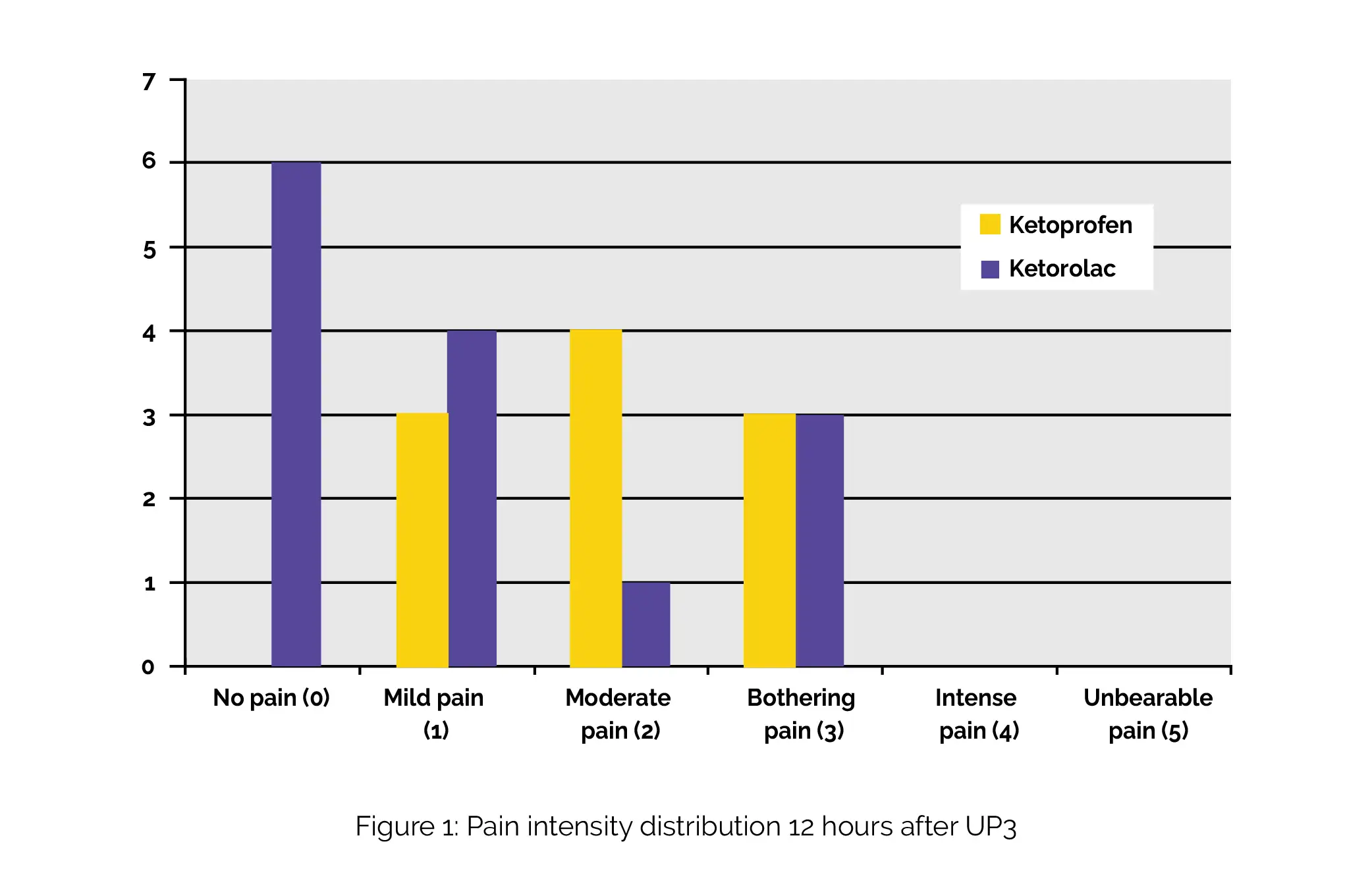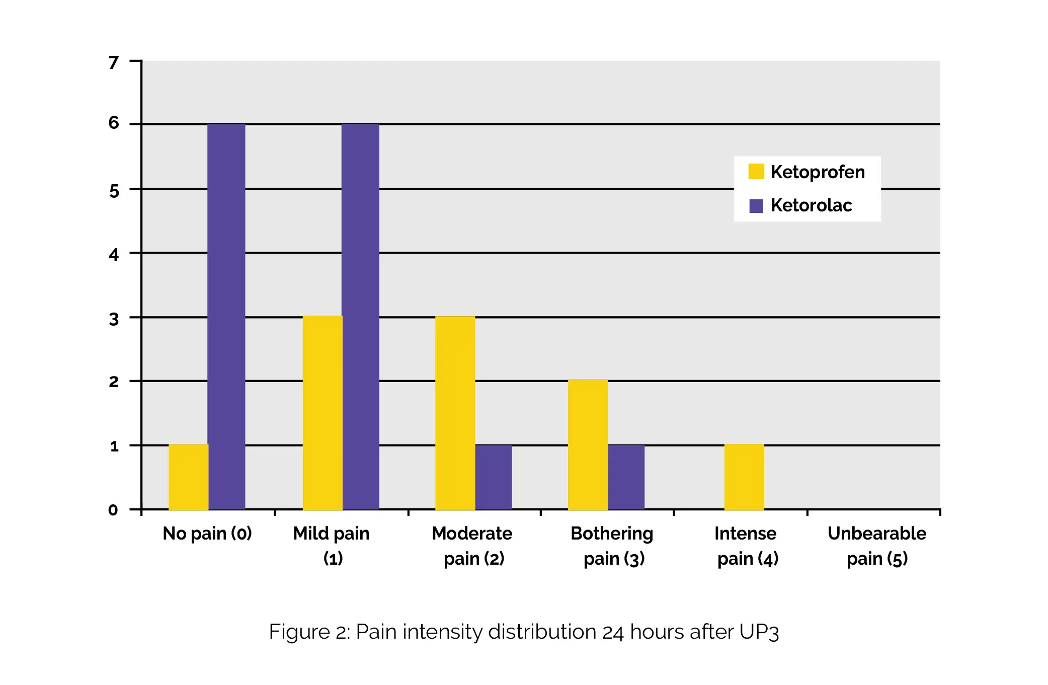 At the 24-hour postoperative mark, 60% of volunteers who received Ketoprofen indicated experiencing moderate or bothersome pain, while 86% of those who were administered Ketorolac reported mild or no pain (Figure 2).