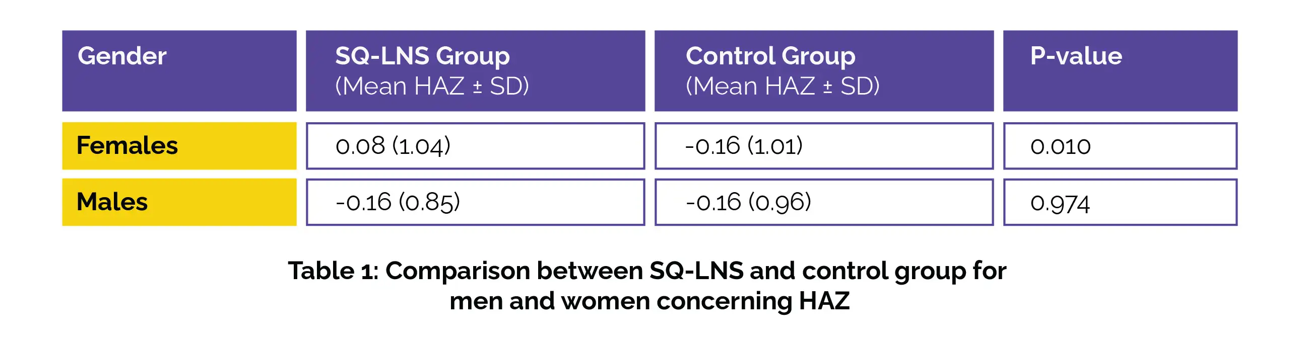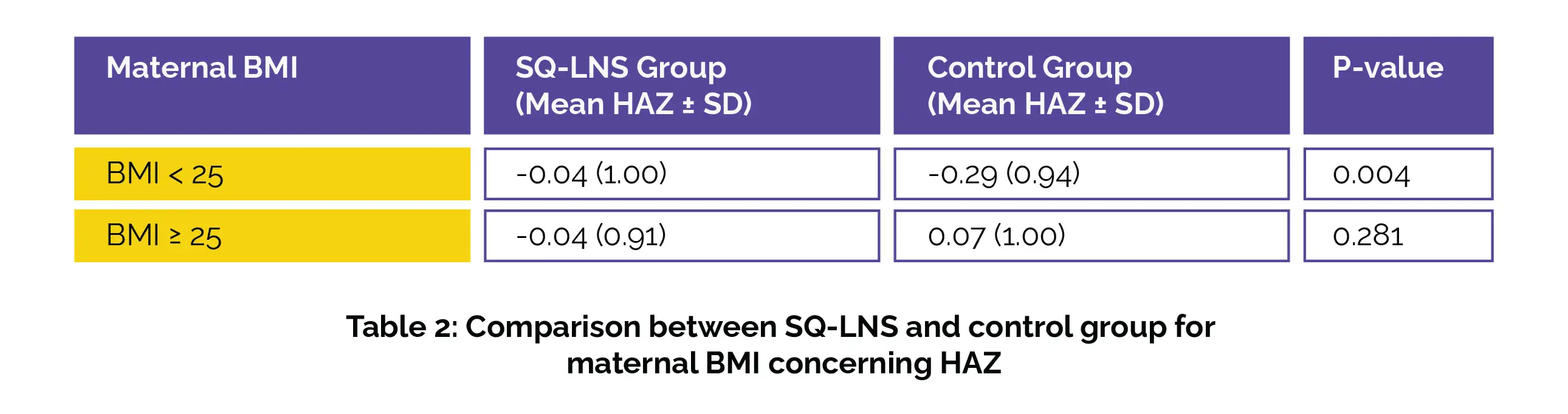 Among children of females with a BMI of less than 25, HAZ was higher in the SQ-LNS compared to the control group; among females with a BMI of more than equal to 25, these parameters did not vary (Table 2):