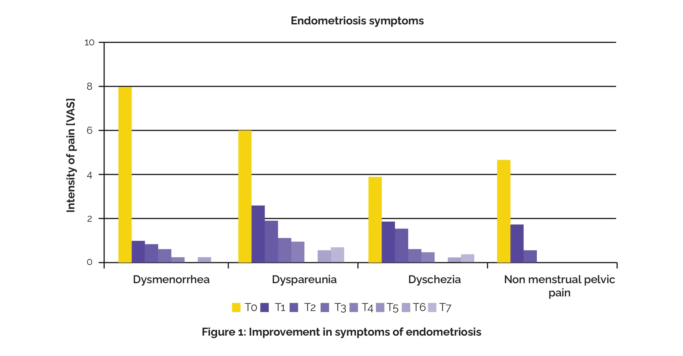 The study encompassed 157 patients, who took Dienogest 2 mg daily. The enrolled subjects were segregated into two groups based on treatment duration. Group A received short-term therapy (0-15 months) while Group B received long-term therapy (over 15 months). The visual analog scale (VAS) scale was employed to evaluate the impact of the drug on pain levels at baseline (T0) and after 12 (T1), 24 (T2), 36 (T3), 48 (T4), 60 (T5), 72 (T6), and 84 (T7) months.