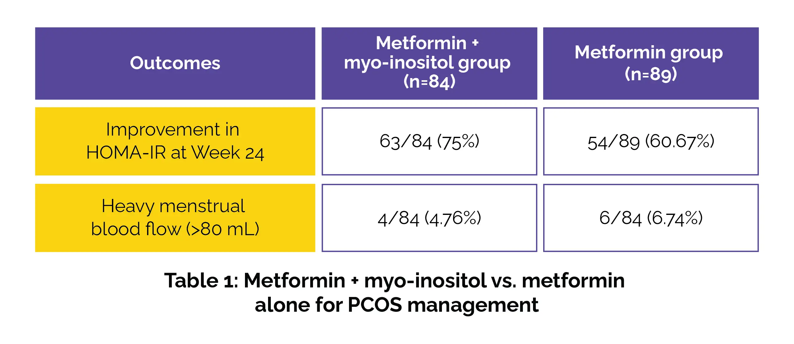 At week 24, a higher proportion of patients in the metformin + myo-inositol group experienced improvements in HOMA-IR when compared to the metformin group. Additionally, fewer patients in the combination group experienced heavy menstrual bleeding (>80 mL), as depicted in Table 1:
