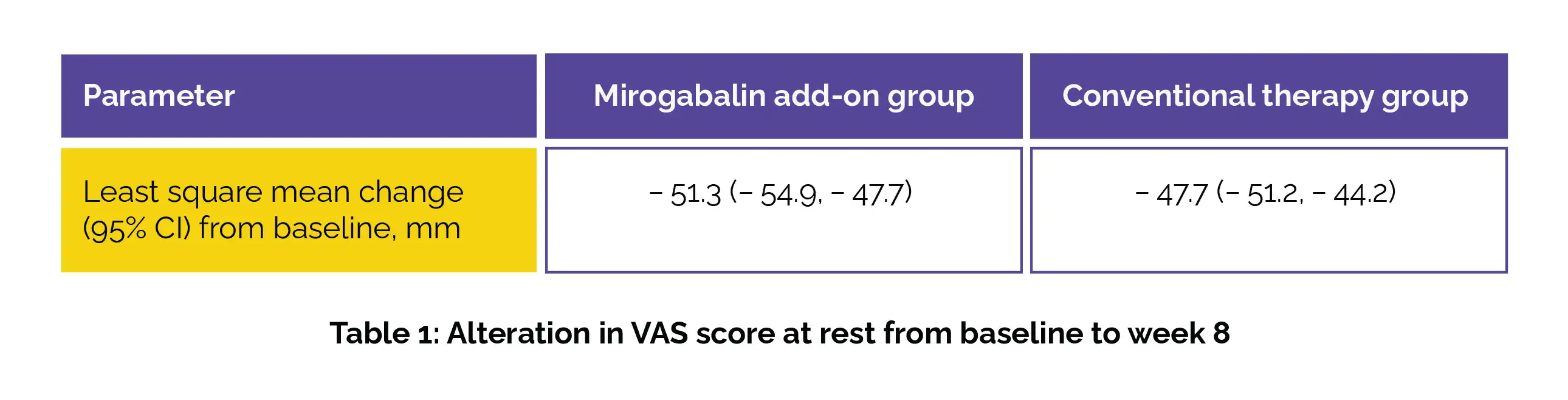 The least square mean change (with 95% confidence interval [CI]) in VAS scores for pain at rest from baseline to week 8 in the study groups is shown in Table 1. The inter-group difference was not clinically meaningful (-3.6 [95% CI: -8.7, 1.5], P = 0.161).