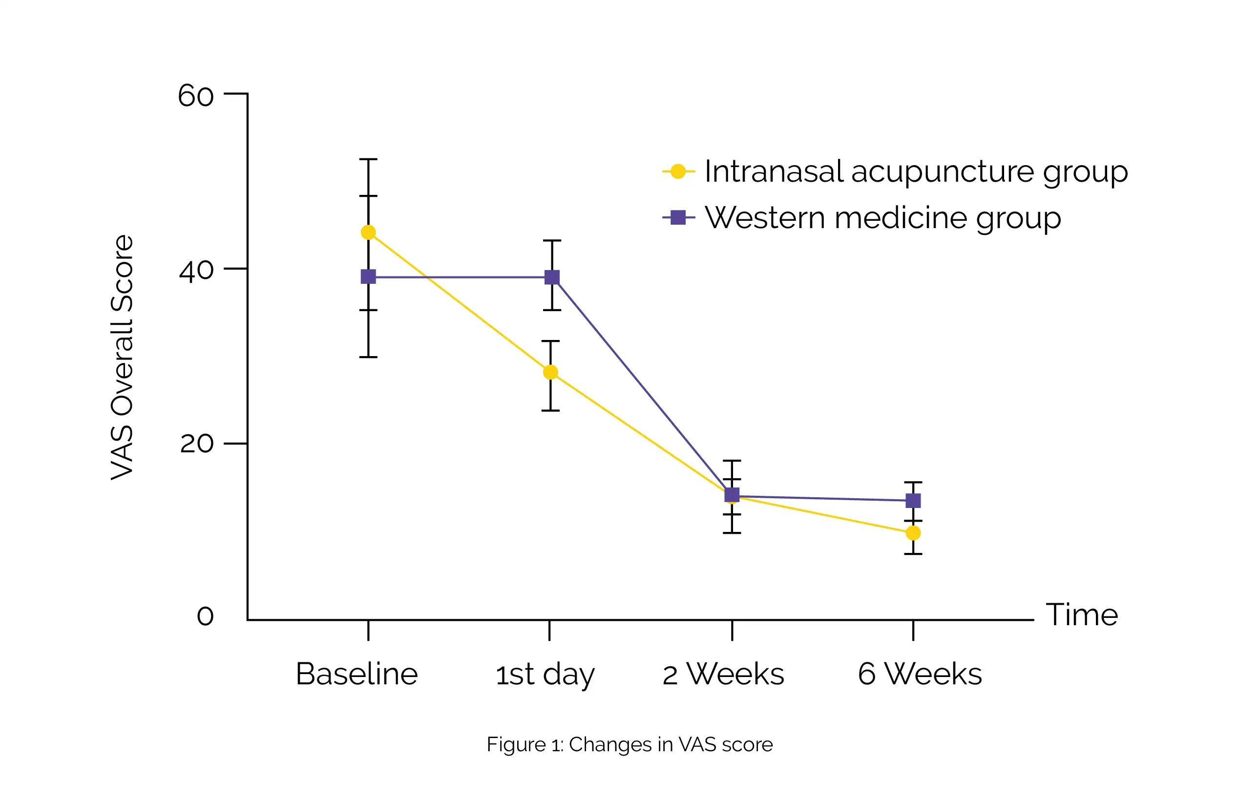 On day 1 (the first treatment), the intranasal acupuncture group's VAS (Figure 1) and RQLQ scores were considerably lower than those of the Western medicine group (P < 0.05; 95% CI −13.1 to −9.6 VAS points), (P < 0.05; 95% CI −20.27 to −12.28 RQLQ points).