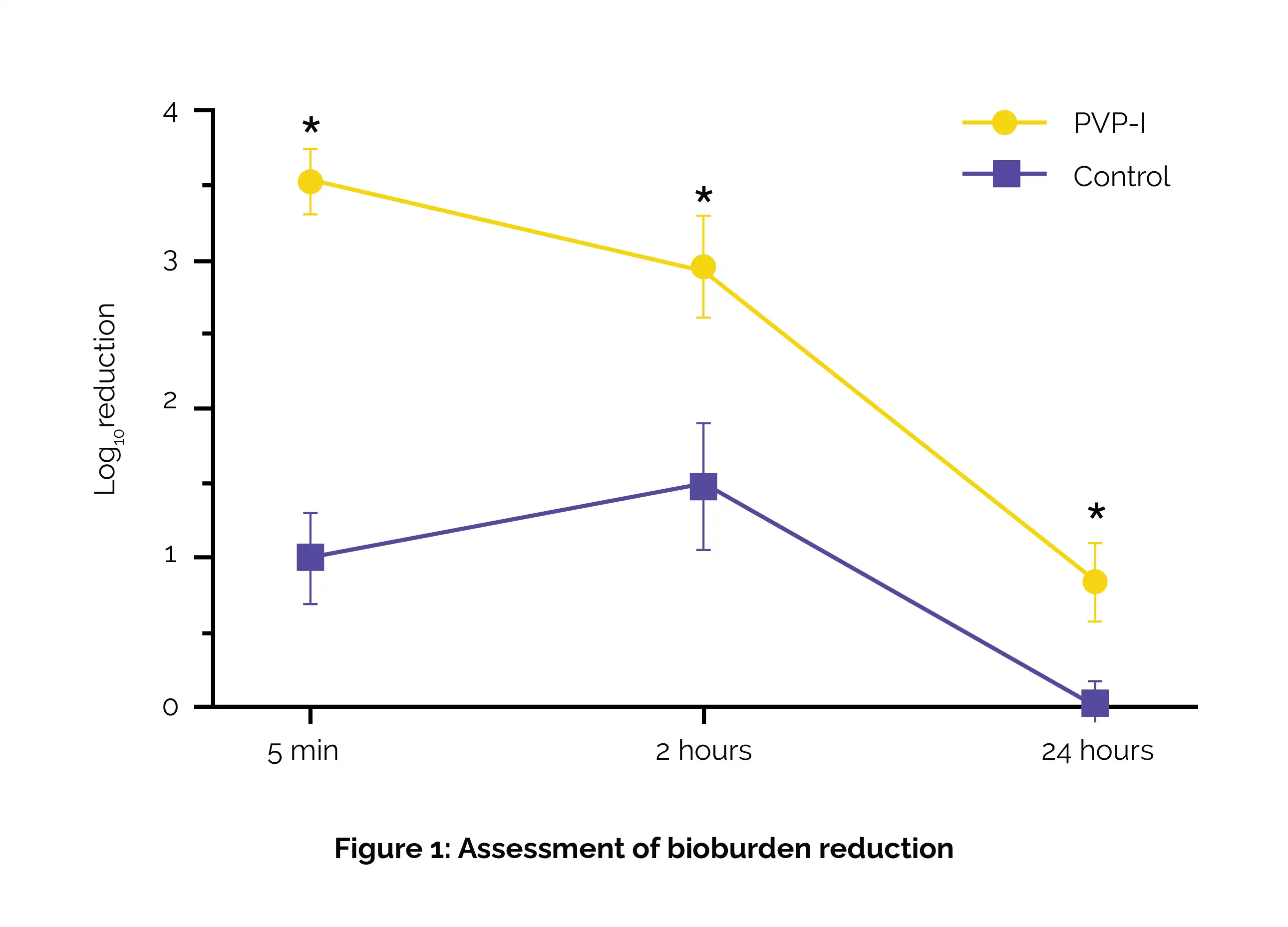 Significant correlations were observed among anaerobic species, Dolosigranulum species,  Corynebacterium species, and Staphylococcus species at the baseline. Following the application of PVP-I, a substantial reduction in bioburden was recorded: log103.538 ± 0.918 at 5 min; log10 2.961 ± 1.466 at 2 hours; and log10 0.849 ± 1.092 at 24 hours; p< 0.01), as shown in Figure 1:
