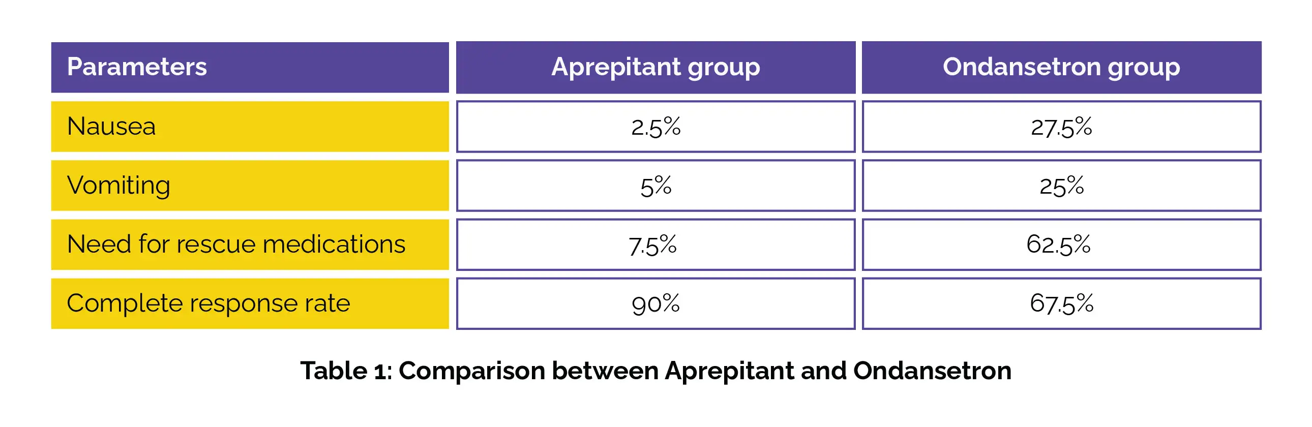 In this randomized controlled trial, there were no profound demographic differences between the groups. Those receiving Aprepitant experienced considerably lower incidence and intensity of nausea, vomiting, and required fewer rescue medications compared to those receiving Ondansetron. Moreover, the Aprepitant arm illustrated a greater complete response rate during the 0-2 and 12-24 postsurgery hours, as shown in Table 1: