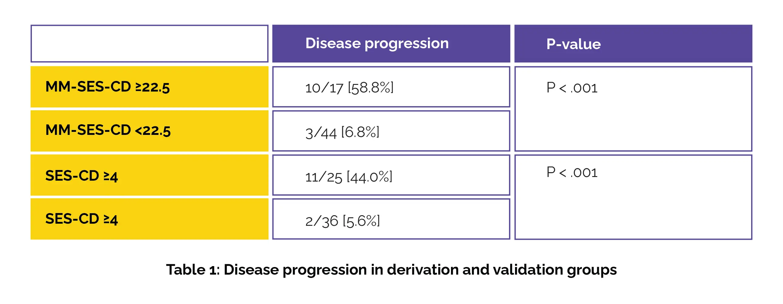 Patients with MM-SES-CD ≥22.5 exhibited a notably higher rate of disease progression than MM-SES-CD <22.5. Similarly, patients with SES-CD ≥4 had a significantly higher incidence of disease progression than those with SES-CD <4, Table 1: