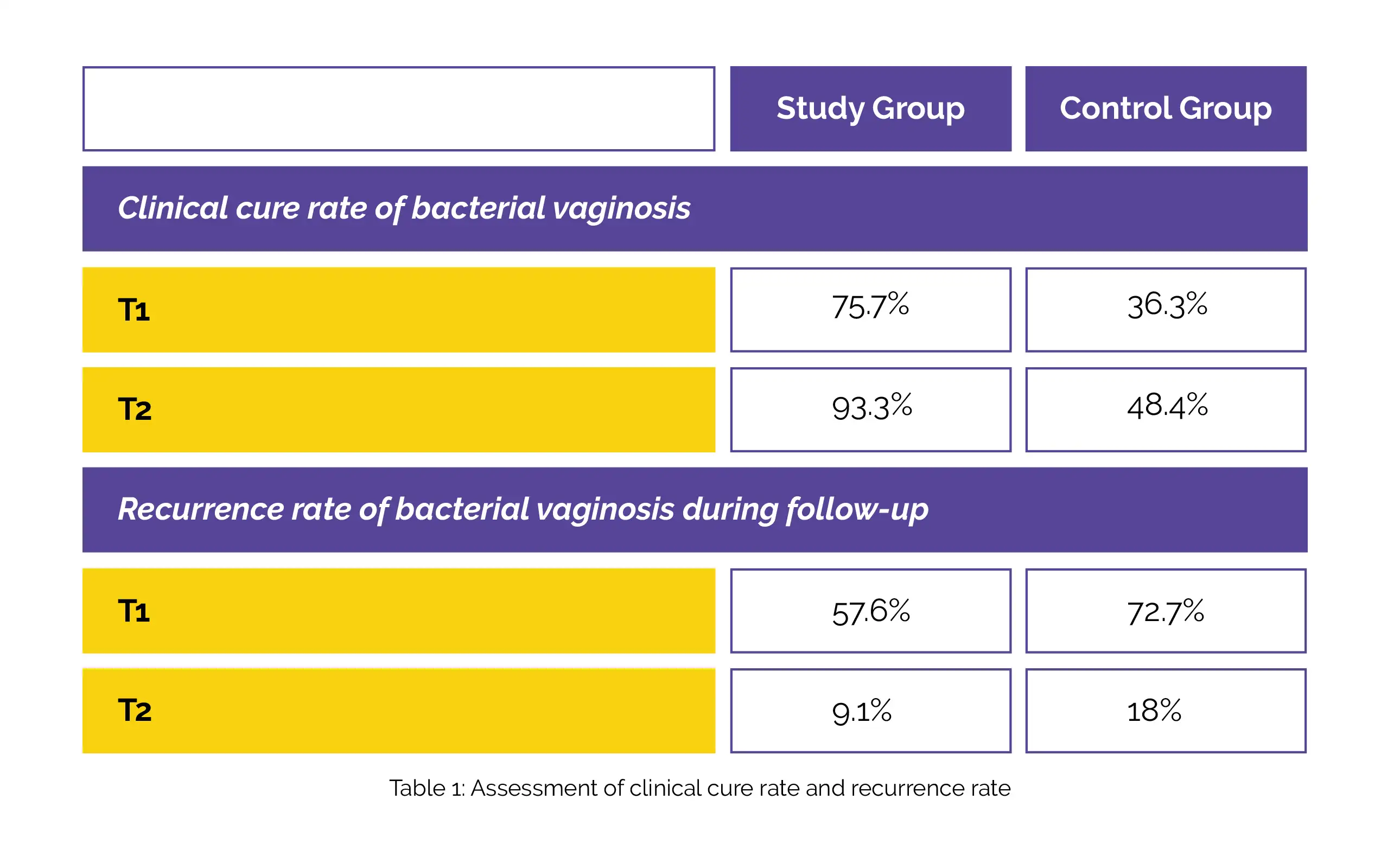 At T1 (1 month) and T2 (2 months), the study group showed a higher rate of microbiological cure (as indicated by Nugent scores) and a lower recurrence rate of bacterial vaginosis when compared to the control group, as indicated in Table 1: