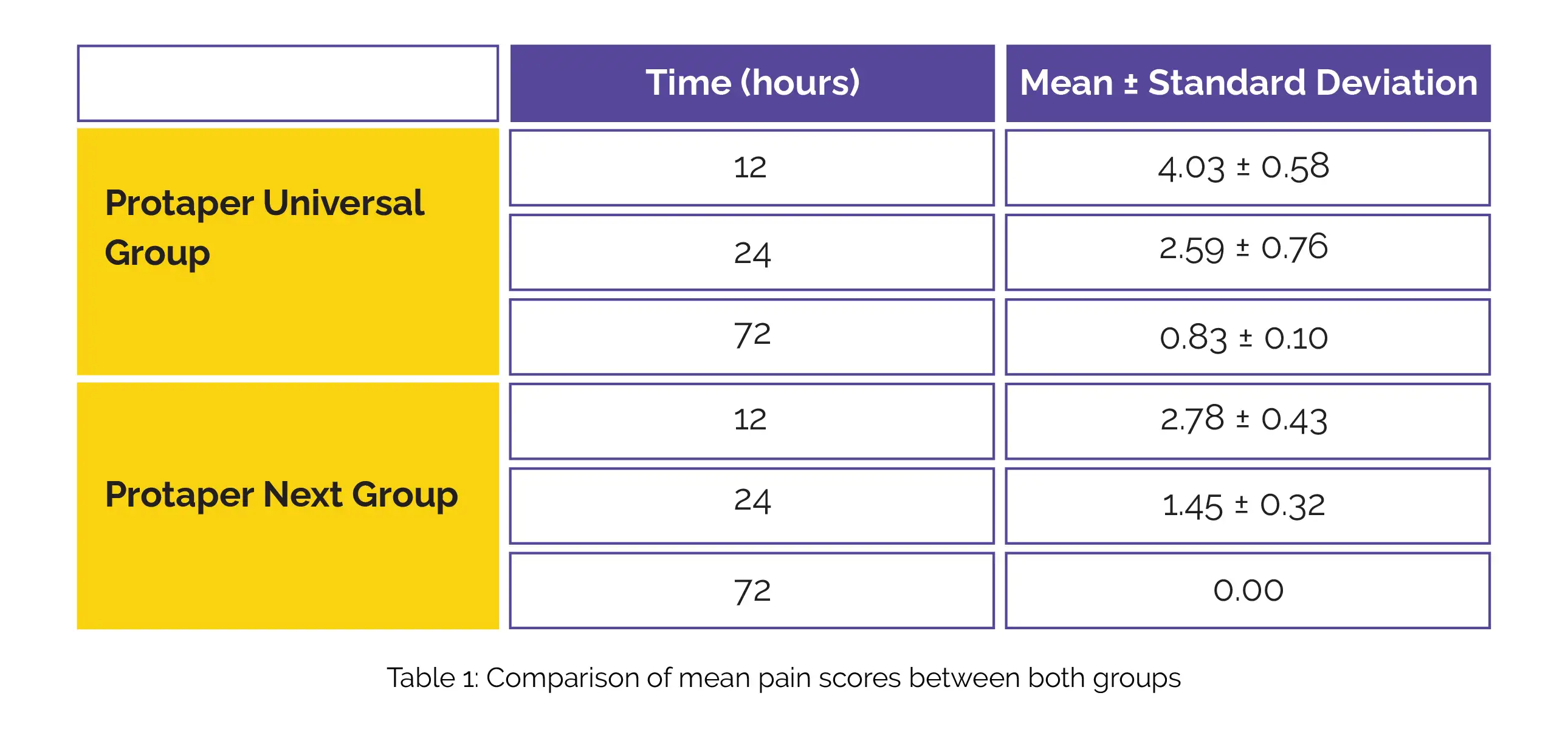 Substantial differences were noted between the two rotary file groups. Specifically, the intensity of postsurgical pain was notably higher in the protaper universal group compared to the protaper next file group (Table 1).