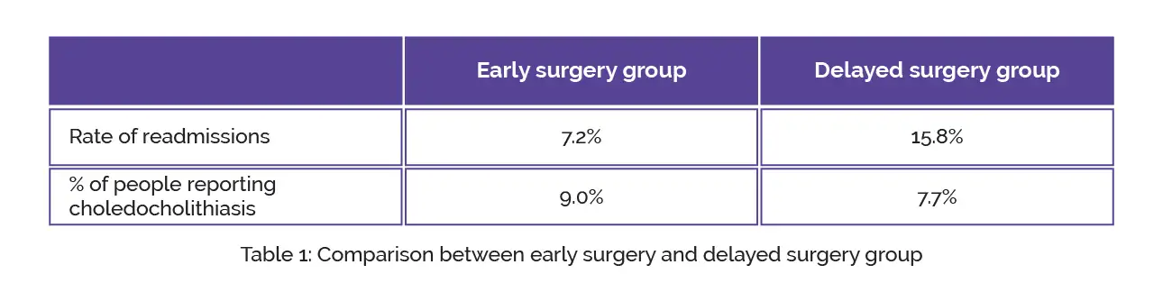 Early surgery lowered the readmission rate for biliary events prior to cholecystectomy by half. The percentage of people reporting choledocholithiasis is shown in Table 1: