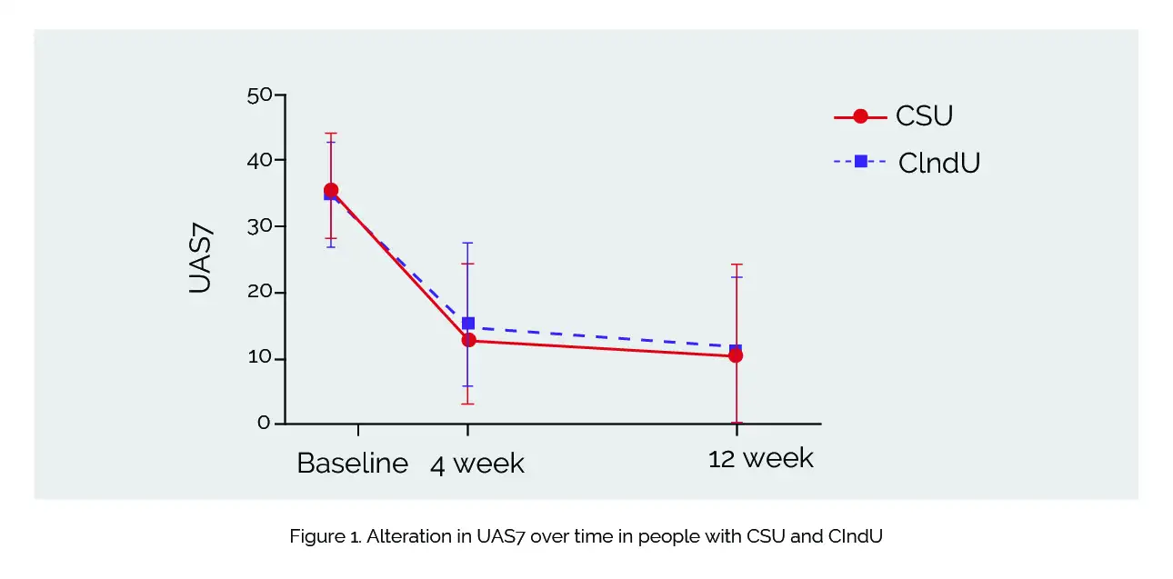 Despite there being no discernible difference in treatment efficacy between the two groups, the symptoms of CSU subjects were reported to recover more quickly.  Furthermore, the number of cyclosporine and antihistamine tablets prescribed daily decreased more noticeably in this patient group. Additionally, individuals with CSU had a greater response rate, and a lower UAS7 score between week 12 and baseline.