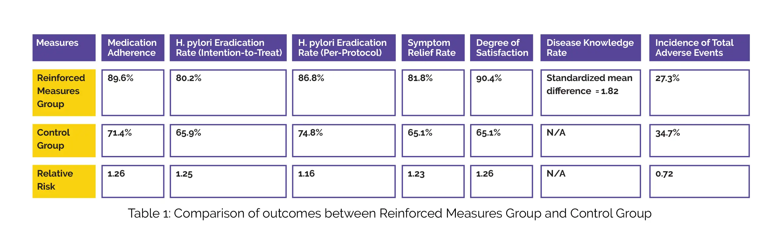 A total of 19 RCTs were analyzed, involving 3286 volunteers. Various strategies were employed to enhance adherence, such as social software, text messages, phone calls, and face-to-face communication. When compared to the control group, patients receiving reinforced measures demonstrated improved medication adherence, higher rates of H. pylori eradication, greater symptom relief, increased satisfaction, improved disease knowledge, and a lower incidence of overall adverse events, as depicted in Table 1:
