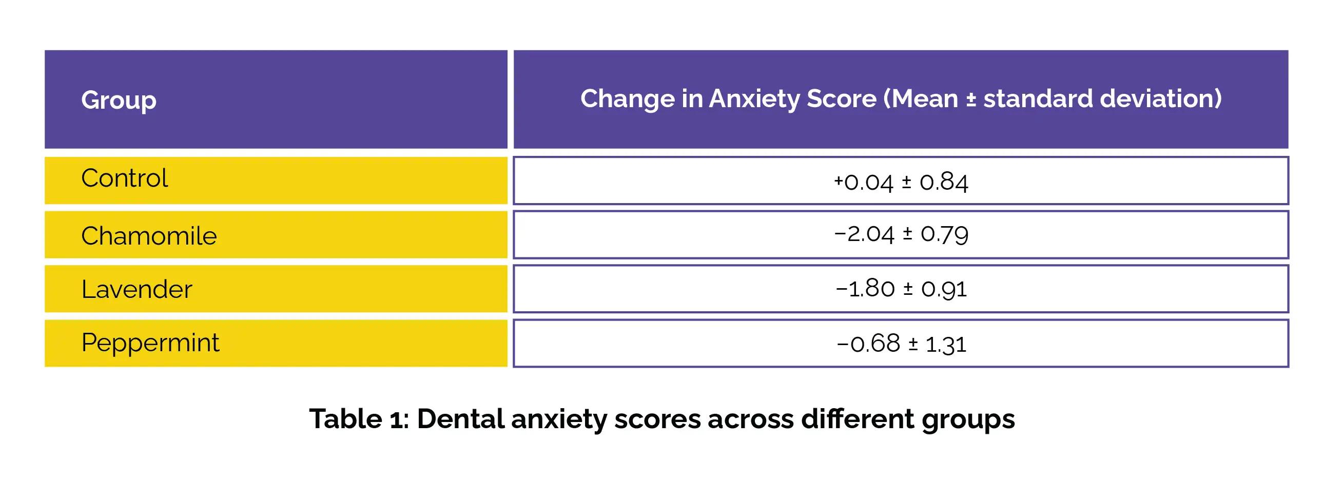 Chamomile and lavender were equally effective in alleviating dental anxiety in children, while peppermint had a milder effect.