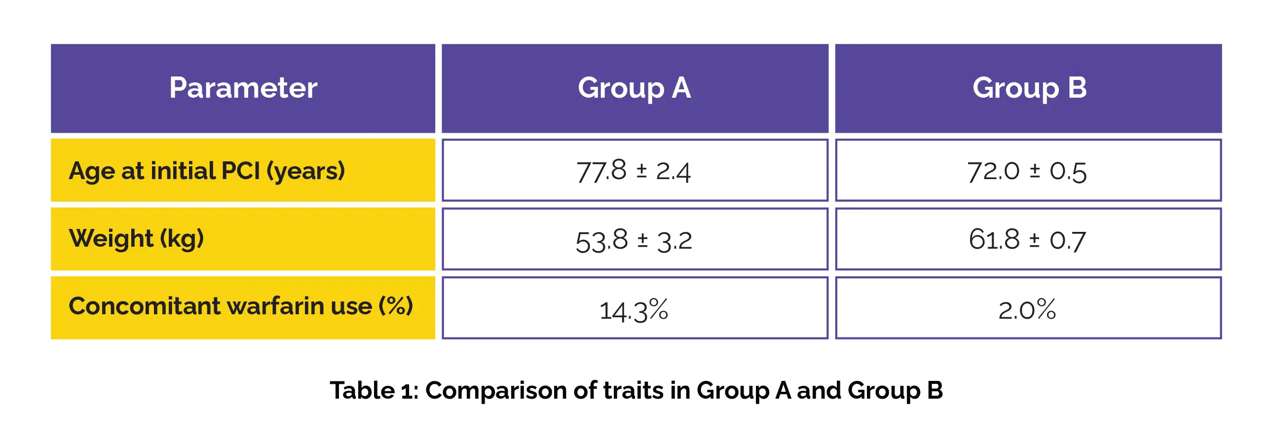 The different characteristics significantly varied in Group A and B patients (Table 1):