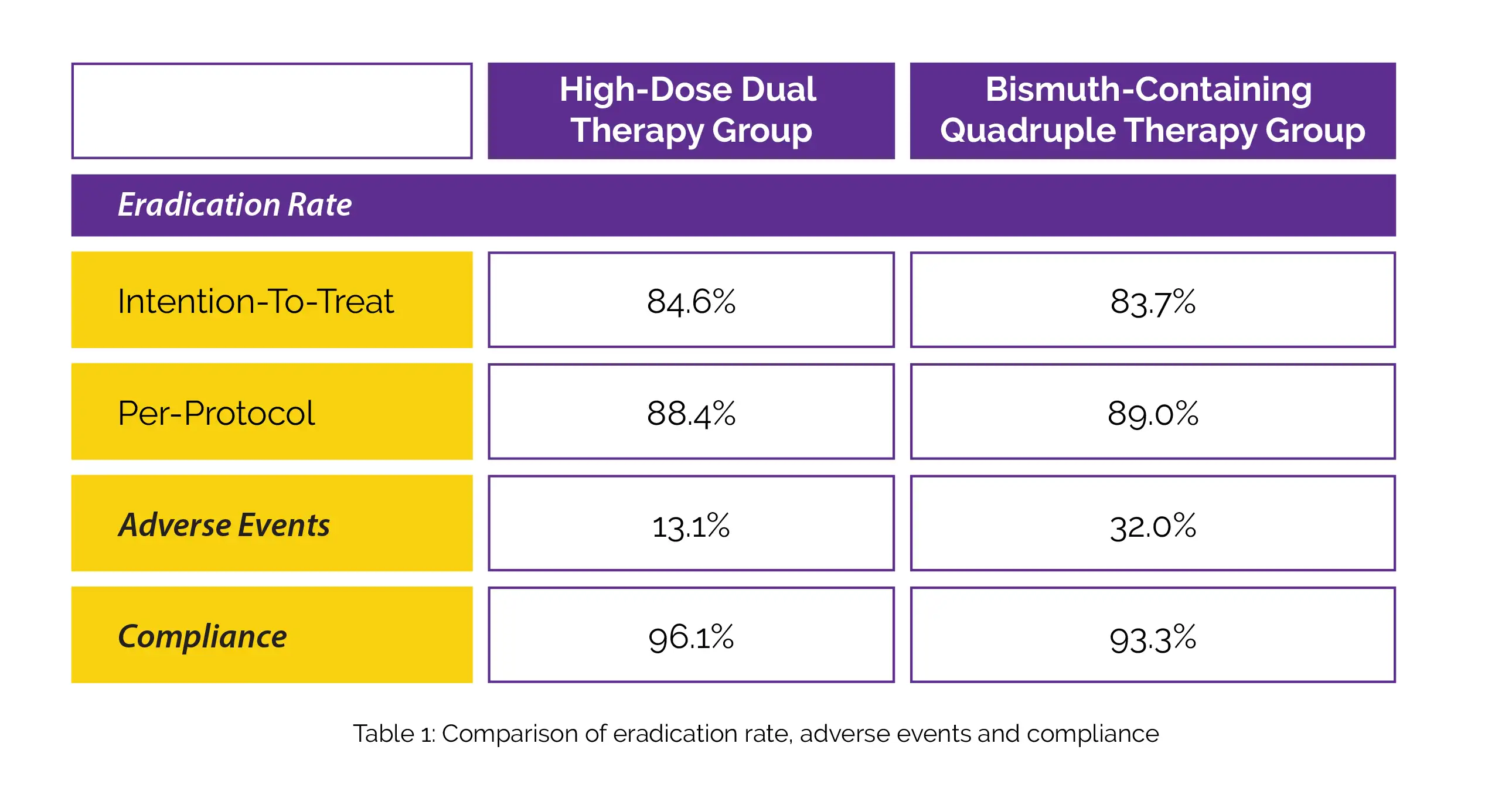 Comparing high-dose dual therapy to quadruple therapy that contained Bismuth, comparable rates of elimination were witnessed. High-dose dual treatment, as opposed to quadruple therapy that contained Bismuth, however, had fewer side effects and improved compliance, as depicted in Table 1: