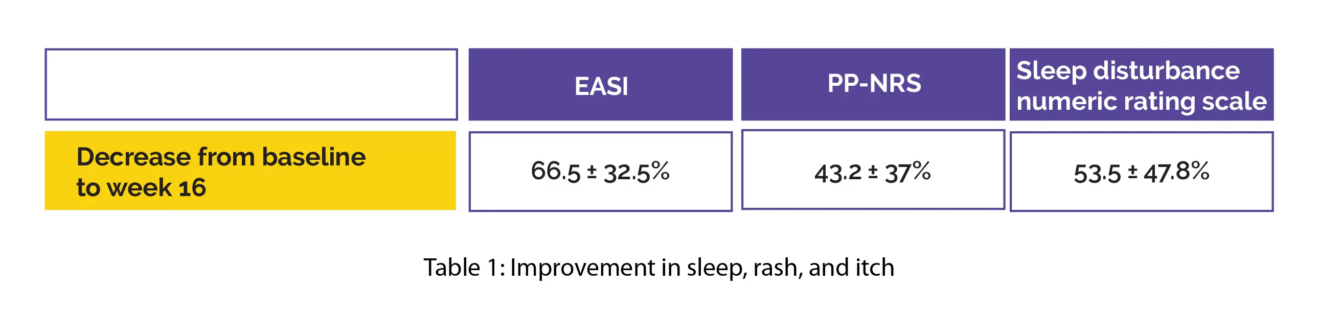 Nemolizumab's pharmacokinetics revealed a mean half-life of 16.7 ± 4.1 days, linear elimination, and a first-order absorption. Over the 16-week therapeutic period, the mean trough concentrations were found to range from 2935 ± 1029 ng/mL to 3292 ± 2018 ng/mL. A significant betterment was reported in sleep, rash, and itch with a reduction from baseline to week 16 in Eczema Area and Severity Index (EASI), PP-NRS, and in sleep disturbance numeric rating scale, as shown in Table 1: