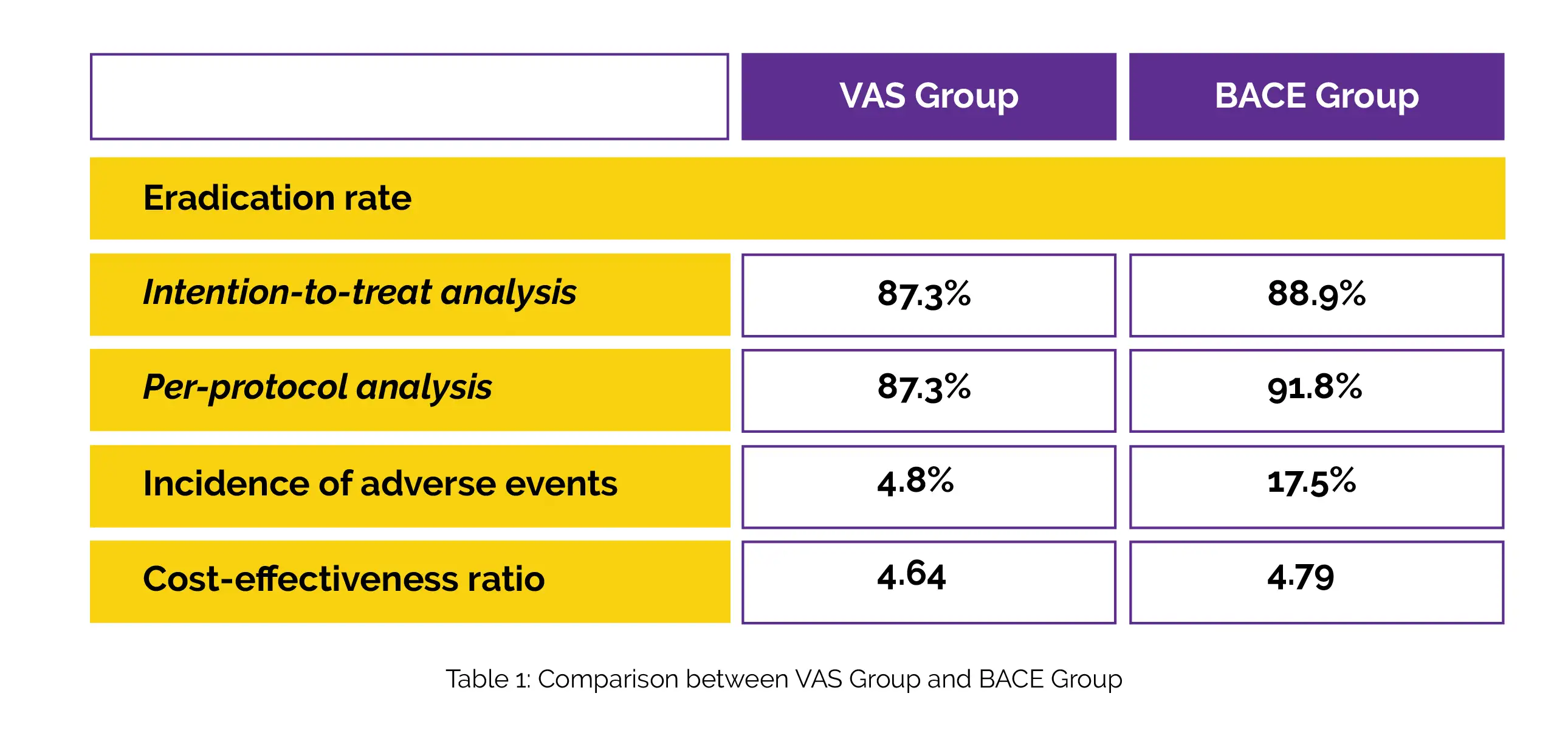 After 135 people were screened, 126 were randomly selected. Table 1 displays the eradication rates for the VAS and BACE groups using both per-protocol analysis and intention-to-treat analysis. In contrast to the VAS group, the BACE group experienced a much greater rate of adverse events. The VAS group's cost-effectiveness ratio was lower than the BACE group's.