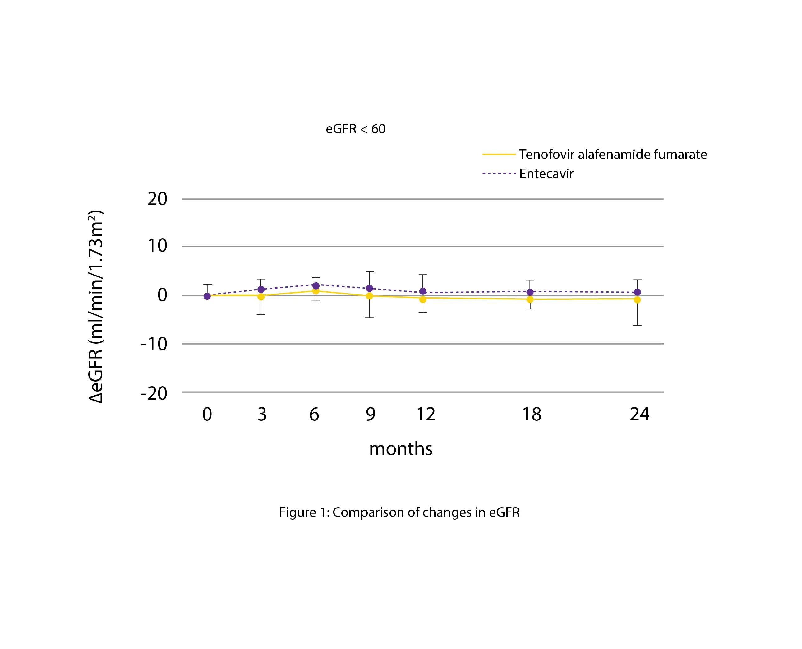 Contrasted with the Entecavir group, the levels of eGFR in the Tenofovir alafenamide fumarate group tended to be lower (-6.15 vs -2.26 mL/min/1.73 m2). There were no discernible differences in individuals whose baseline eGFR was below 60 (0.40 vs. -2.49 mL/min/1.73 m2), as depicted in Figure 1: