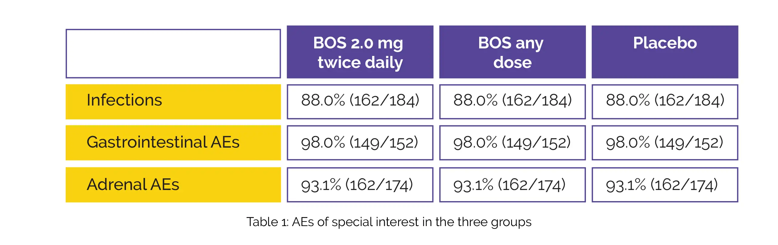 Adrenal AEs were more common with BOS 2 mg twice daily and BOS any dose compared to placebo. The treatment-emergent AEs and AEs of special interest linked with the study’s investigational therapy or leading to withdrawal were rare.