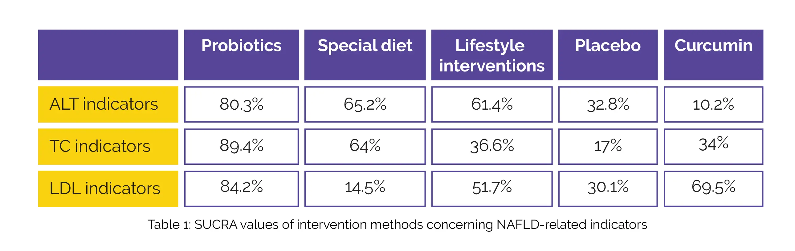 The use of probiotic therapy was found to be the most effective intervention to improve NAFLD indicators. Expert advice on dietary modifications or exercise (workout) was a more effective non-pharmacological therapy for NAFLD compared to no intervention.