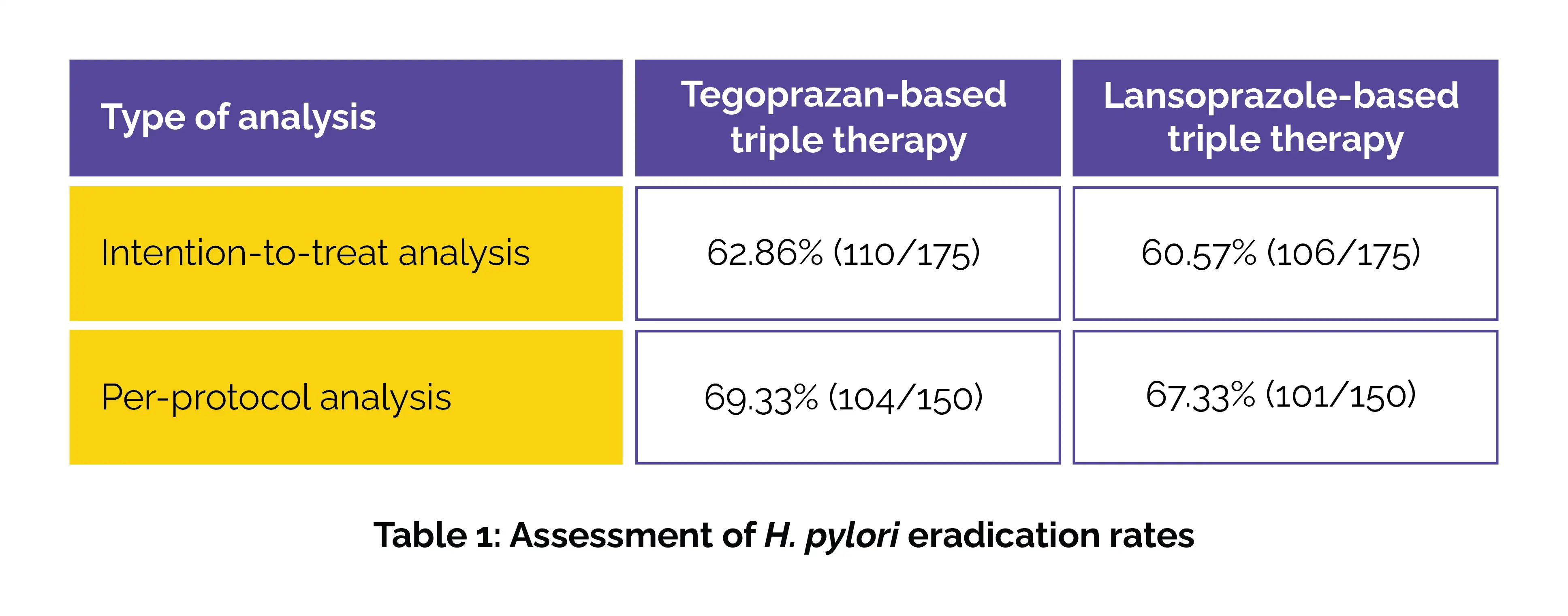 Among 350 enrolled patients, the eradication rates were strikingly close in the intention-to-treat and per-protocol analysis—demonstrating non-inferiority (Table 1).
