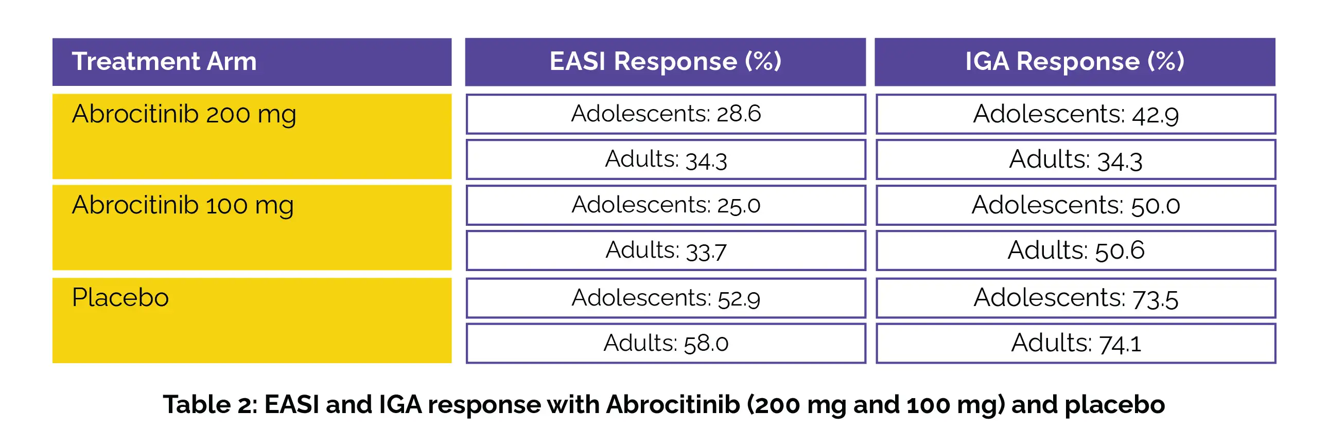 Out of 246 adolescents, 145 (58.9%), and among 981 adults, 655 (66.8%) responded to the induction. They experienced comparable proportions of flare during maintenance with Abrocitinib and placebo, as shown in the following Table 1: