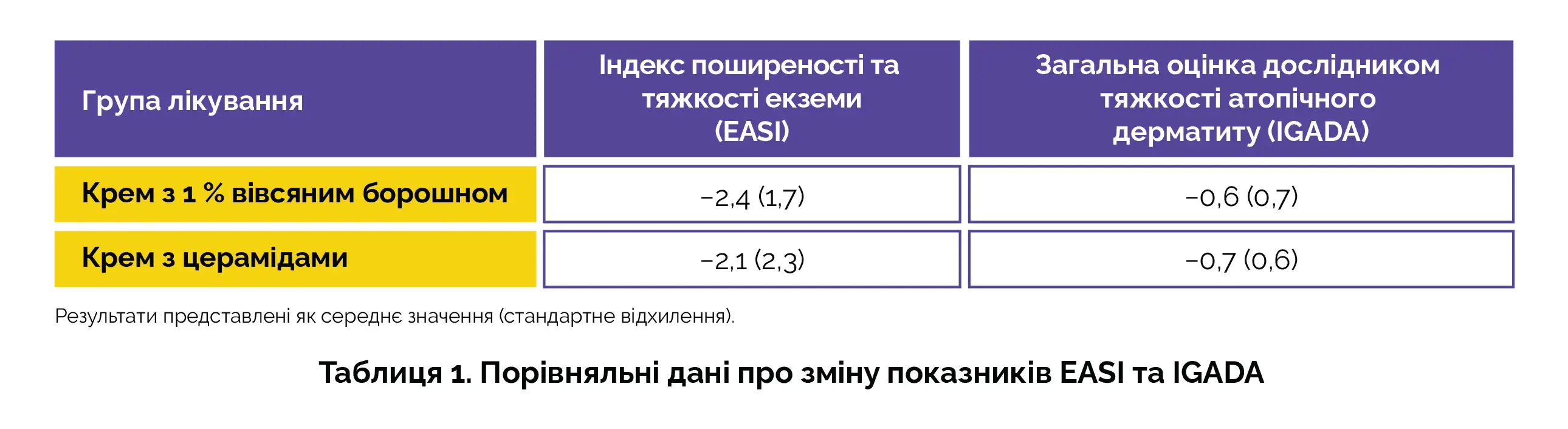 Було відзначено покращення суб'єктивних оцінок ознак/симптомів екземи. Обидва втручання добре переносилися. Таким чином, безрецептурний крем на основі 1% вівсяного борошна (при застосуванні не рідше двох разів на добу) не менш ефективний і безпечний, ніж рецептурний бар'єрний крем і є новим, бюджетним, швидкодіючим засобом для лікування АТ легкого/помірного ступеня тяжкості у дітей-афроамериканців / представників негроїдної раси.