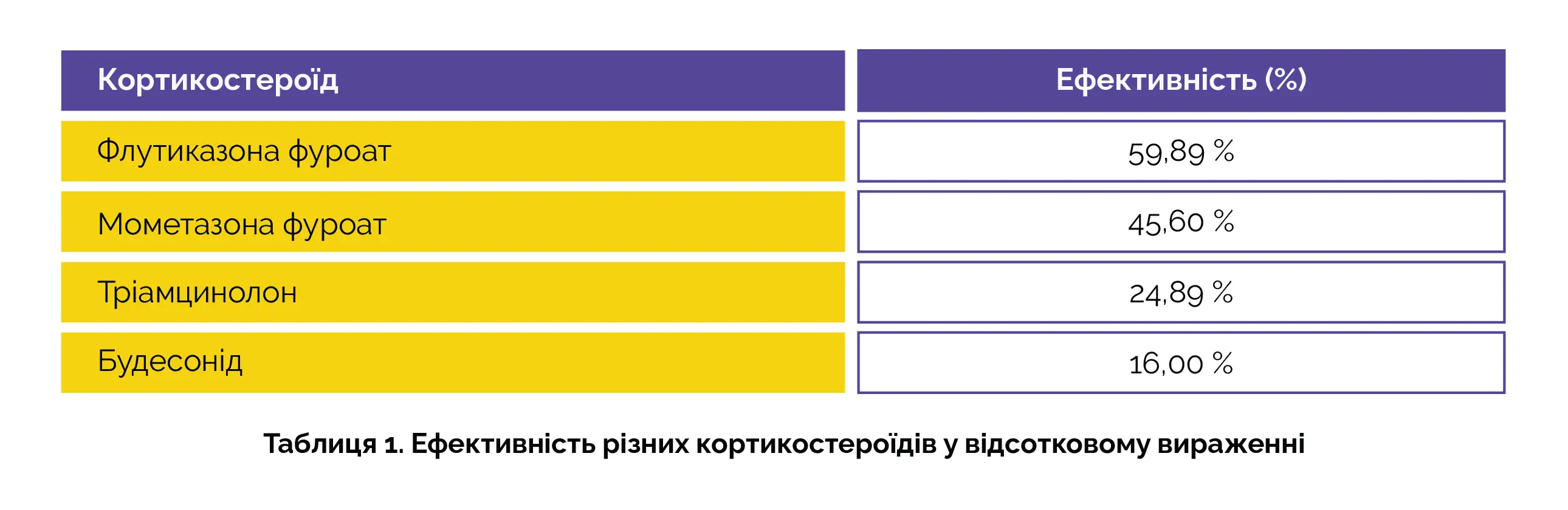 Ефективність з точки зору покращення оцінки за шкалою загальної виразності очних симптомів (TOSS) оцінювали за допомогою метааналізу, порівнюючи кожен кортикостероїд з плацебо. У межах аналізу економічної ефективності враховували витрати протягом року і результати з погляду тайського суспільства. Коефіцієнт додаткової ефективності витрат було зрівняно. Також було проведено ймовірнісний аналіз чутливості усунення невизначеностей параметрів. У цей аналіз було включено 3722 пацієнти з сезонним АР із 13 рандомізованих контрольованих досліджень, які відповідали критеріям включення. Ефективність різних кортикостероїдів у відсотковому вираженні зазначена у таблиці 1: