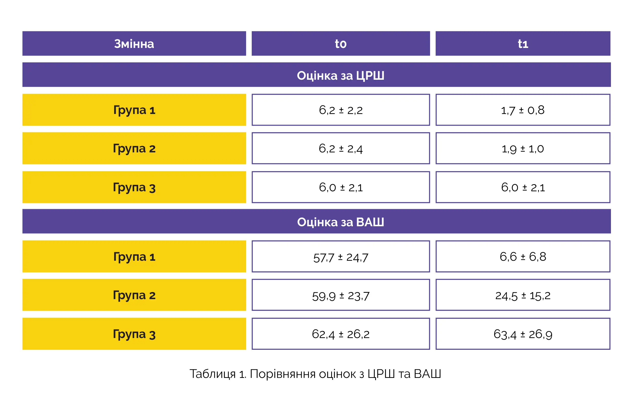 Щодо оцінок за ВАШ, то результати були аналогічними (див. таблицю 1).