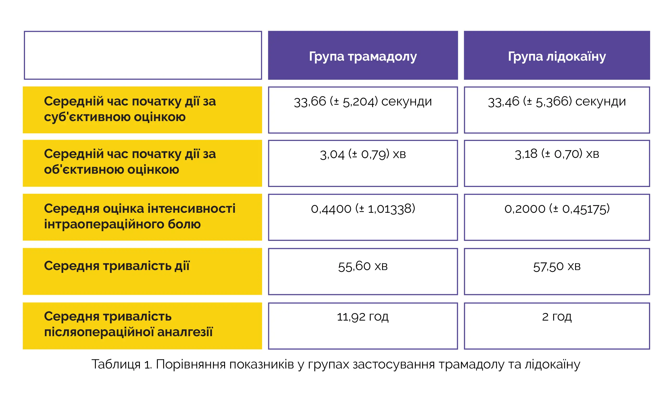 Оцінювали такі показники, як розвиток алергічної реакції, тривалість дії, інтенсивність болю під час операції, початок дії та післяопераційний знеболювальний ефект. Щодо середньої тривалості дії та середнього часу початку дії за суб'єктивною та об'єктивною оцінками статистично значущих відмінностей між групами не відзначалося. Проте за показниками середньої оцінки інтенсивності інтраопераційного болю (від 0 до 10 за візуальною аналоговою шкалою) та середньої тривалості післяопераційної аналгезії було виявлено статистично значущі міжгрупові відмінності (див. таблицю 1).
