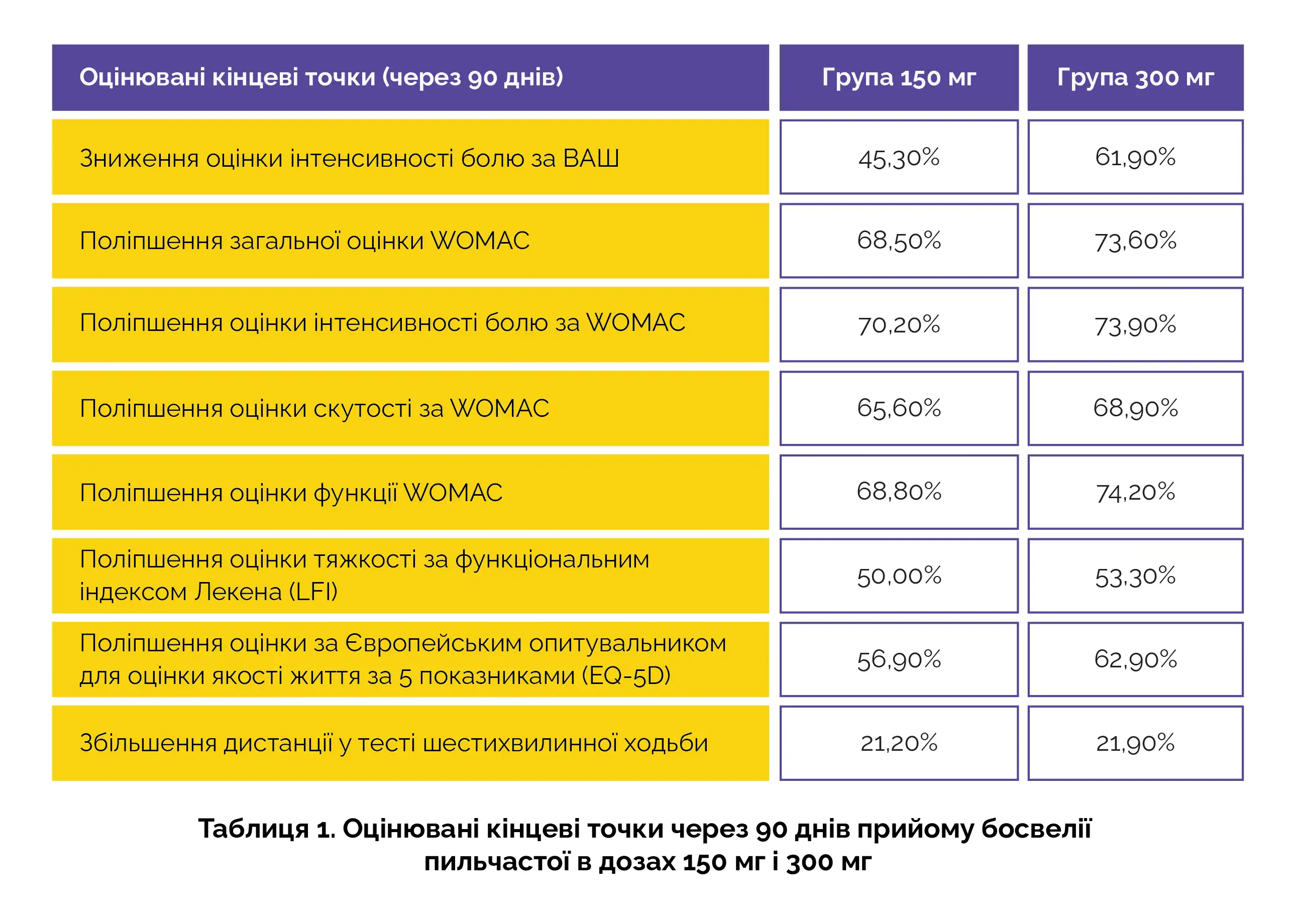 Крім того, в ході подвійного сліпого плацебо-контрольованого дослідження також оцінювали рівні біомаркерів запалення та безпеку. Дослідження завершили 98 учасників. Поліпшення оцінок інтенсивності болю було відзначено вже через п'ять днів після початку прийому добавки в обох дозах – 150 мг та 300 мг. Через 90 днів учасники, які приймали босвелію пильчасту, відзначили значні поліпшення щодо інтенсивності болю, функції та рухливості (див. таблицю 1).