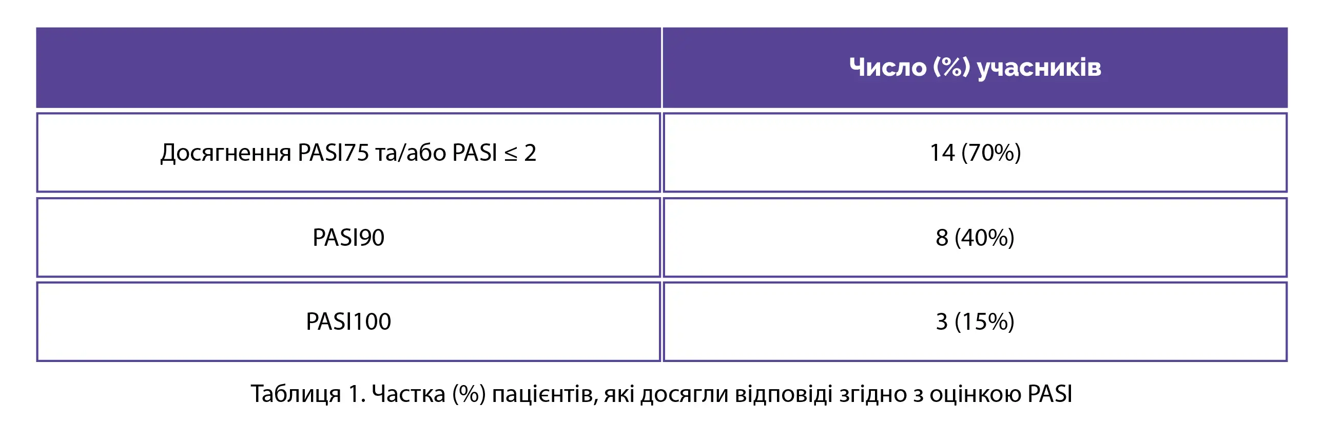 Основною кінцевою точкою дослідження була частка (%) пацієнтів, які досягли зниження абсолютного індексу площі ураження та тяжкості псоріазу (PASI) до ≤ 2 балів (PASI ≤ 2) та (або) зниження відносного показника PASI 75% (PASI75) через 12 тижнів лікування. Оцінку концентрації цитокінів у плазмі проводили на початковому рівні і через 12 тижнів лікування. Кількість пацієнтів, які досягли показників PASI75 та (або) PASI ≤ 2, PASI90 і PASI100 через 12 тижнів лікування (за оцінкою методом підстановки відсутніх даних з урахуванням всіх пацієнтів, що вибули з дослідження, як не відповіли на лікування), наведено в таблиці 1.