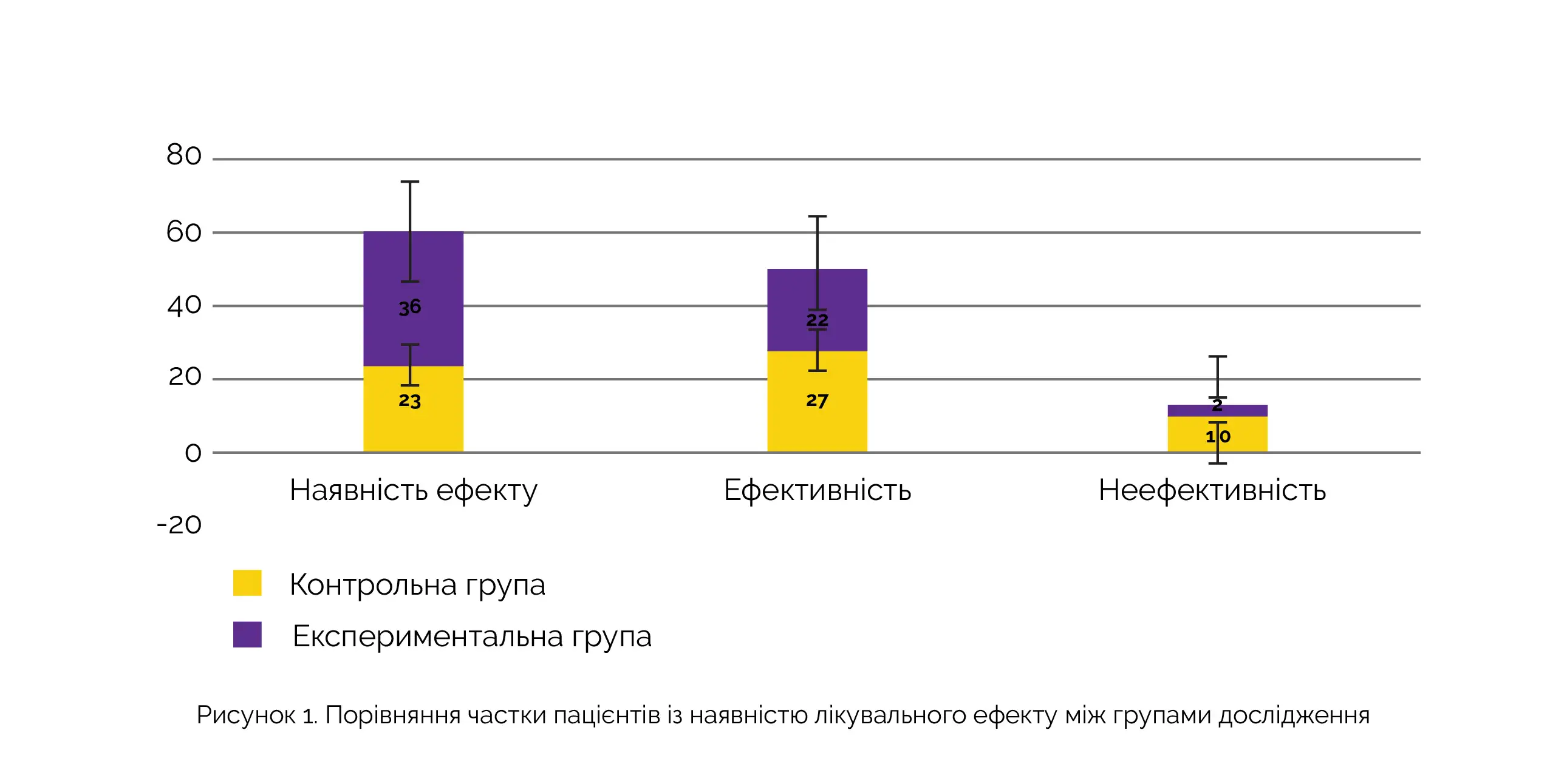 В експериментальній групі ефективність лікування склала 96,67%, при цьому у 36 пацієнтів ефективність була виразною, а у 22 пацієнтів – середньою, у 2 пацієнтів лікування було неефективним. У контрольній групі ефективність лікування склала 83,33%, при цьому у 23 пацієнтів ефективність була виразною, у 27 – середньою, у 10 пацієнтів лікування було неефективним. Ефективність лікування в експериментальній групі була вищою, ніж у контрольній групі (див. рисунок 1).