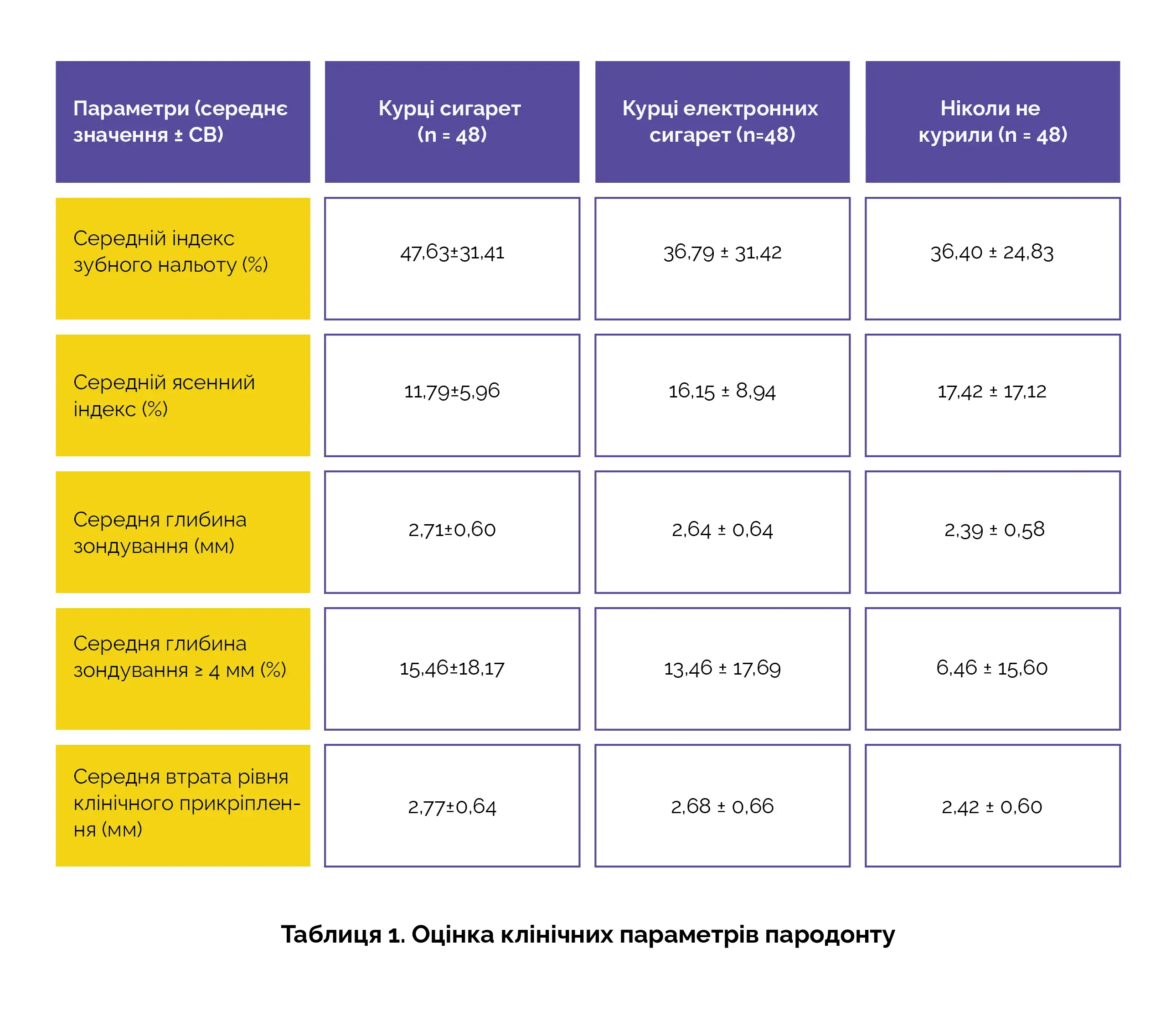 Згідно з результатами статистичного аналізу, у курців сигарет відзначали статистично значуще велику глибину пародонтальної кишені при зондуванні, більшу частку глибини кишені ≥ 4 мм і більш виражену втрату рівня клінічного прикріплення порівняно з користувачами електронних сигарет і такими, що ніколи не курили. З іншого боку, у користувачів електронних сигарет спостерігалися вищі показники ясневого індексу (див. таблицю 1).