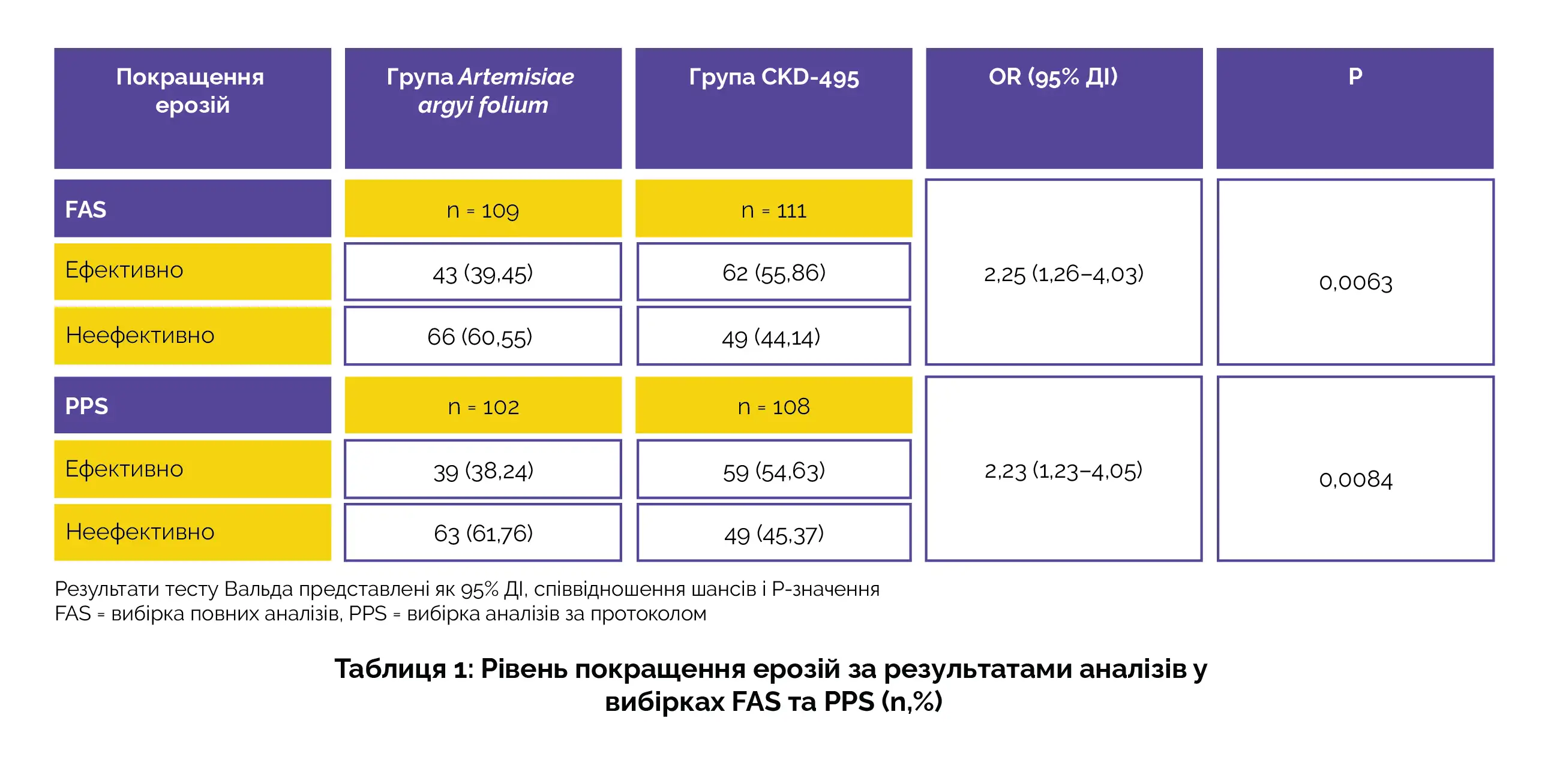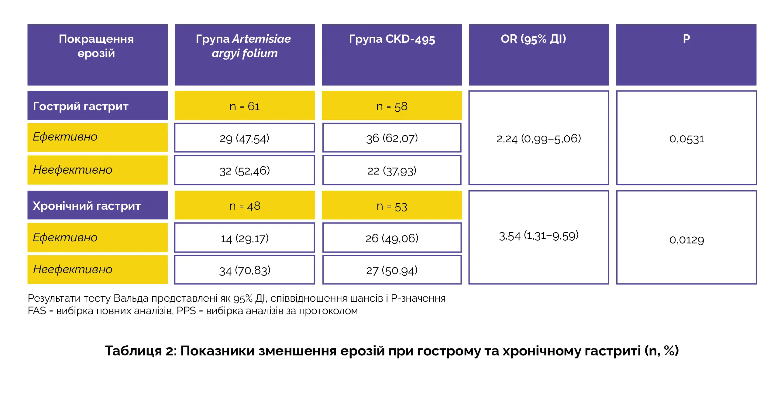 Результати були виражені через 95% довірчий інтервал (95% ДІ), співвідношення шансів (OR) і значення P. У рамках аналізу FAS, особи в групі CKD-495 продемонстрували вищу швидкість полегшення ерозій порівняно з особами в групі AAF. Подібні темпи покращення ерозії також були відзначені в аналізі вибірки PPS (табл. 1).