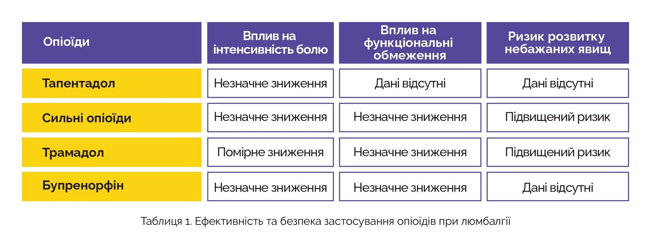 Опіоїди: дані щодо ефективності та безпеки застосування різних опіоїдів для лікування люмбалгії узагальнені в таблиці 1.