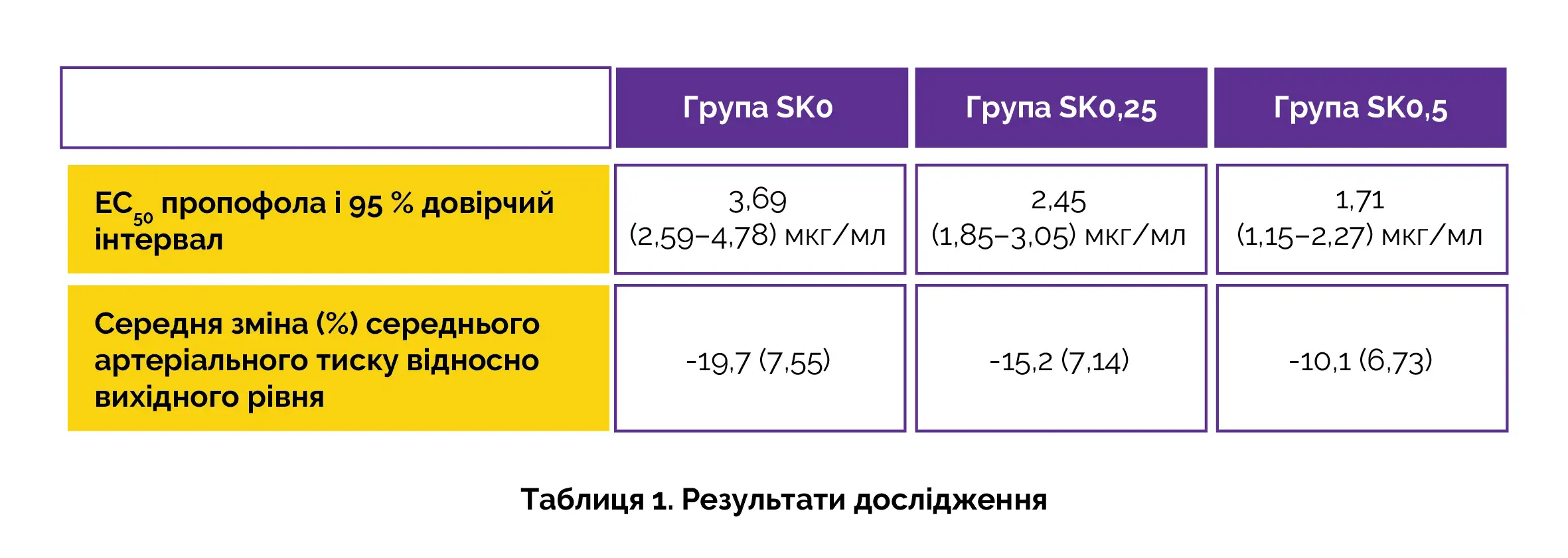 Автори дослідження дійшли висновку, що при введенні пропофолу в поєднанні з ескетаміном з ескалацією дози розвиток артеріальної гіпотензії малоймовірний, при цьому забезпечується більш швидке відновлення.