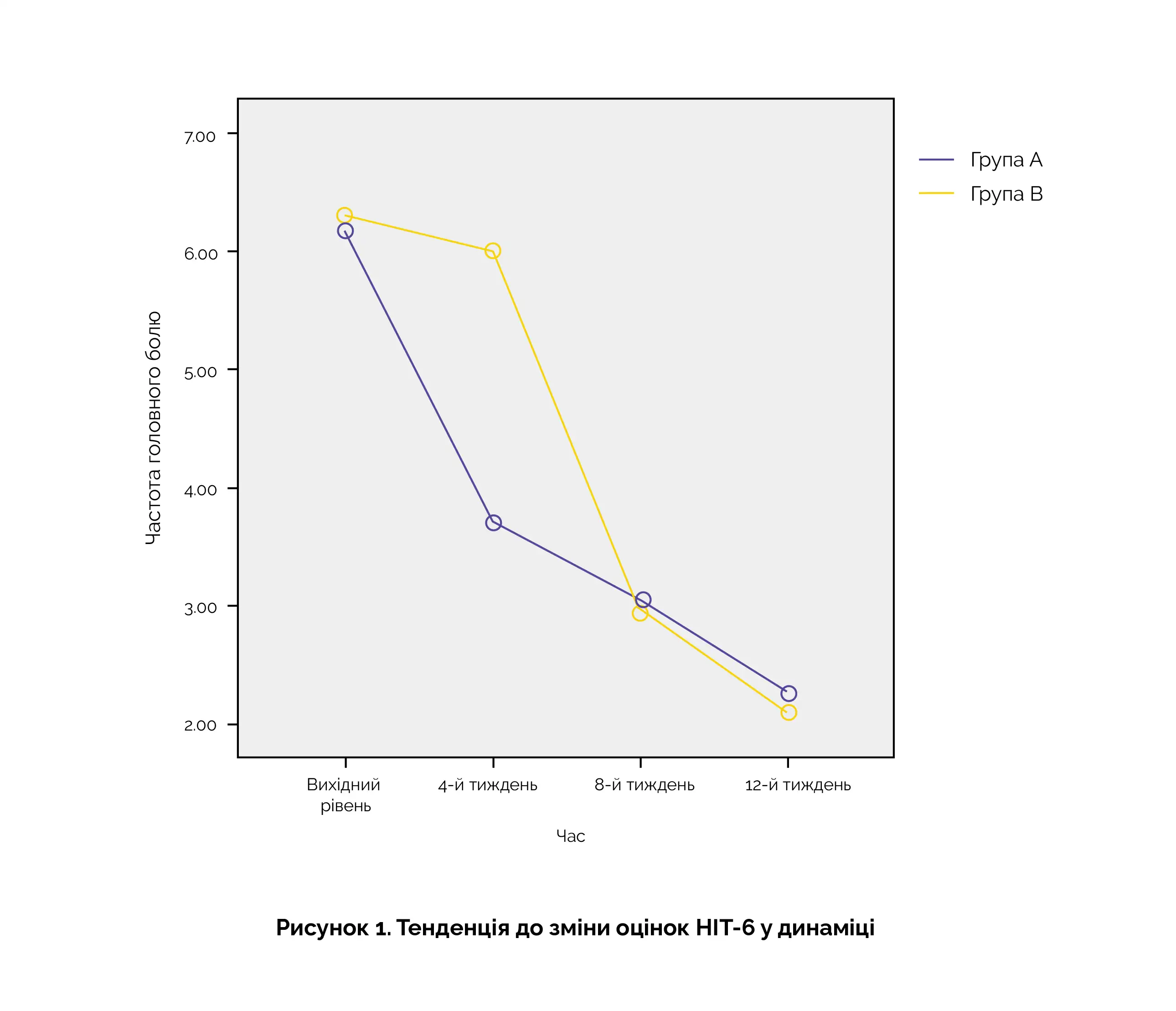 Додаткові кінцеві точки включали оцінку за шкалою тривоги Гамільтона (HAMA) та оцінку непрацездатності, спричиненої головним болем (HDI), а також моніторинг негативних явищ. Серед 87 пацієнтів, які пройшли скринінг на відповідність критеріям включення, 60 були визнані придатними для участі у дослідженні. Хоча відмінності в оцінці HIT-6 і тяжкості головного болю між двома групами на початковому рівні не були статистично значущими, після сеансів КСТ на 4-му тижні (група А) і 8-му тижні (група B) були отримані результати, що представляють інтерес (див. малюнок 1).