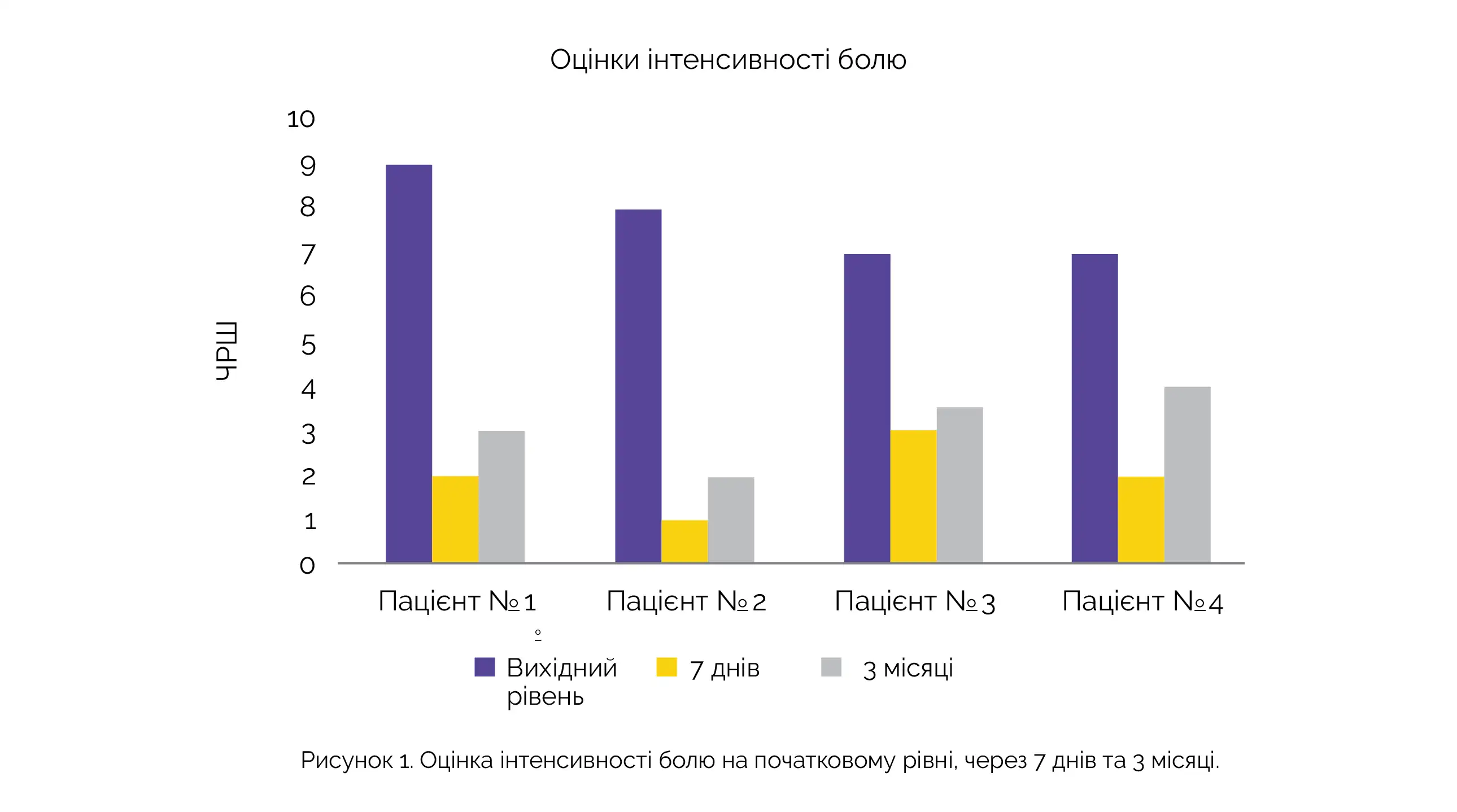 Вплив втручання оцінювали за числовою рейтинговою шкалою (ЧРШ) оцінки інтенсивності болю, а також за зміною оцінки якості життя та дозування лікарських препаратів на 7-й день та через 3 місяці. Через 3 місяці у 2 добровольців спостерігалося полегшення болю >50 %, а у двох інших — на 50 % (рисунок 1):