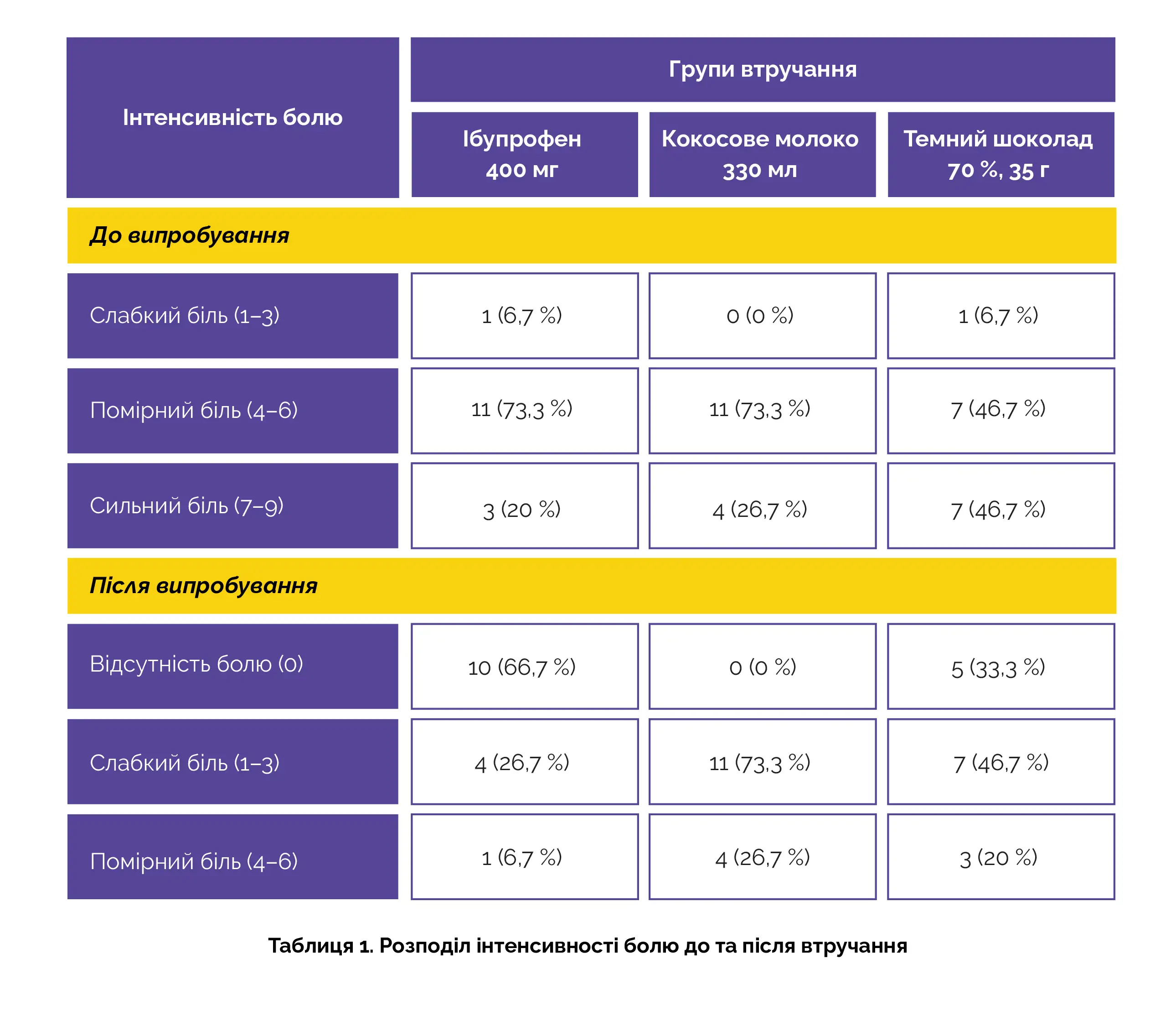 До дослідження було включено 45 учасниць, яких рандомізували до 3 груп. Учасниці однієї групи отримували молоко зеленого кокосу (330 мл), учасниці іншої групи – 70% темний шоколад (35 г), а учасниці третьої групи – ібупрофен (400 мг). Ці втручання проводили на початку менструації, коли жінки зазвичай зазнають симптомів дисменореї.