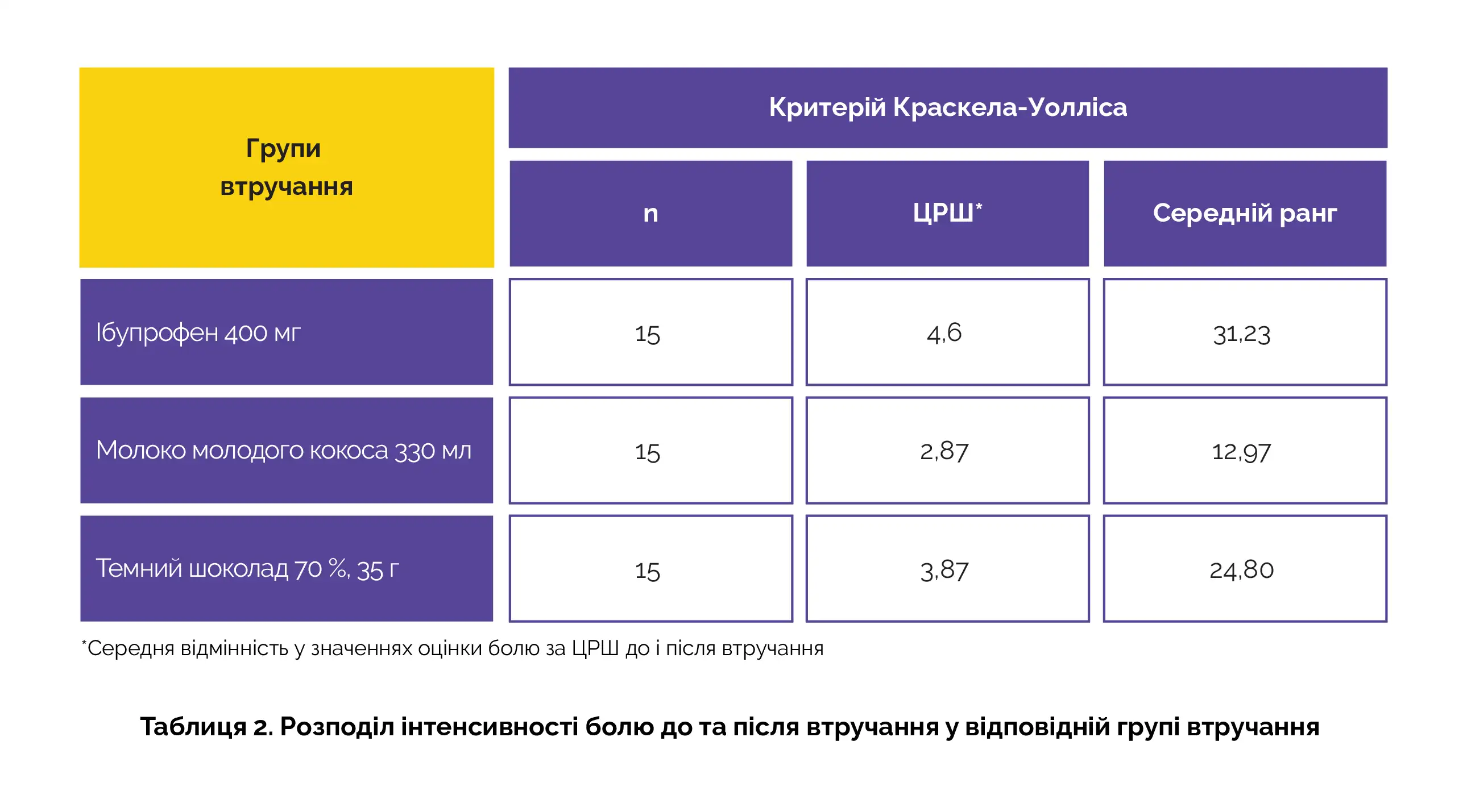 Застосування ібупрофену в дозі 400 мг виявилося найефективнішим втручанням, за яким слідувало вживання 35 г 70 % темного шоколаду, при цьому вживання 330 мл молока молодого кокосу було найменш ефективним. Ці результати розширюють наше розуміння варіантів лікування первинної дисменореї та підкреслюють ефективність застосування ібупрофену.