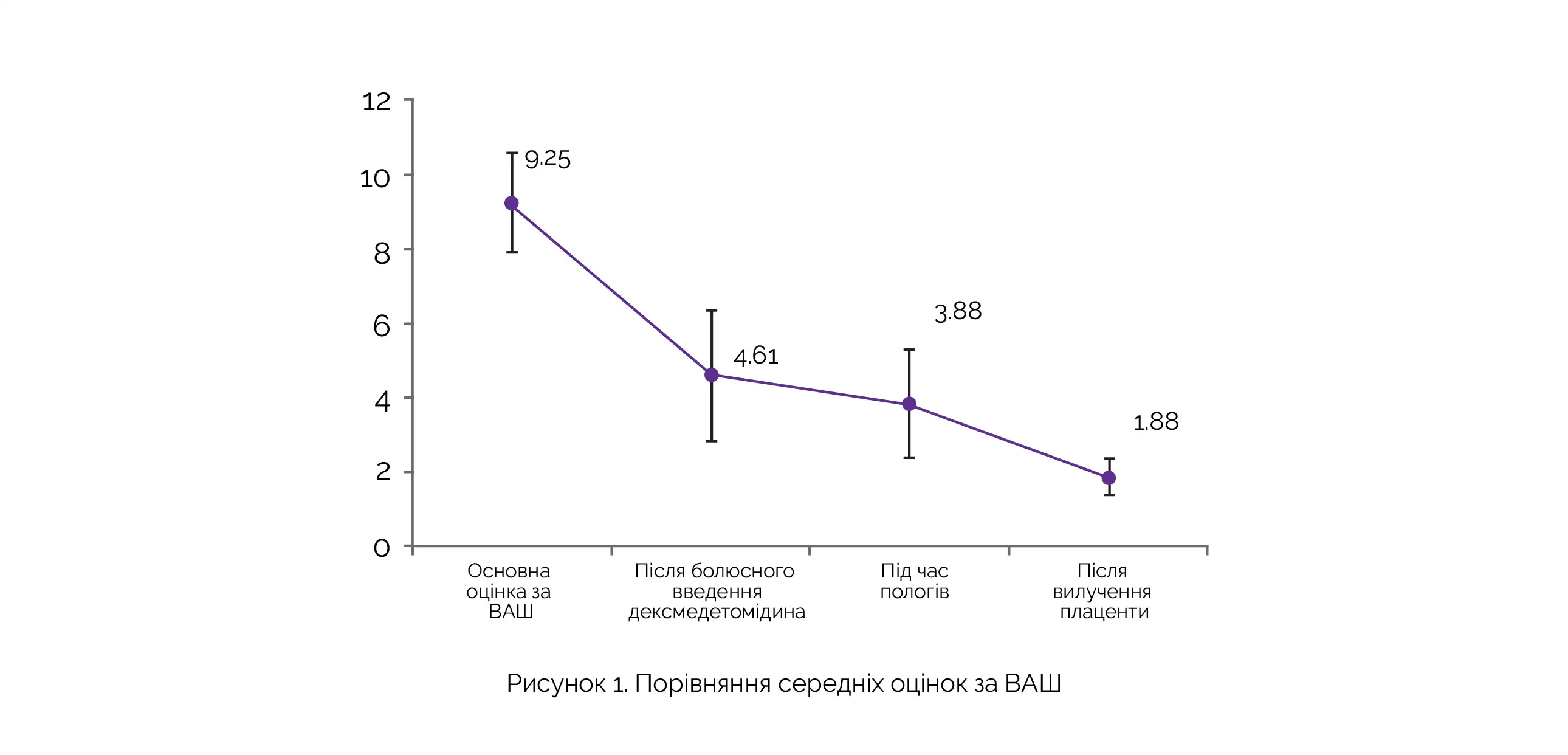 У групі втручання активна фаза пологів була значно коротшою, ніж у контрольній групі. Після застосування дексмедетомідину було відзначено статистично значуще зниження середньої оцінки за візуальною аналоговою шкалою (ВАШ): з 9,25 бала на вихідному рівні до 4,61 бала після введення препарату, 3,88 бала під час пологів та 1,88 бала після вилучення плаценти (Див. рисунок 1).