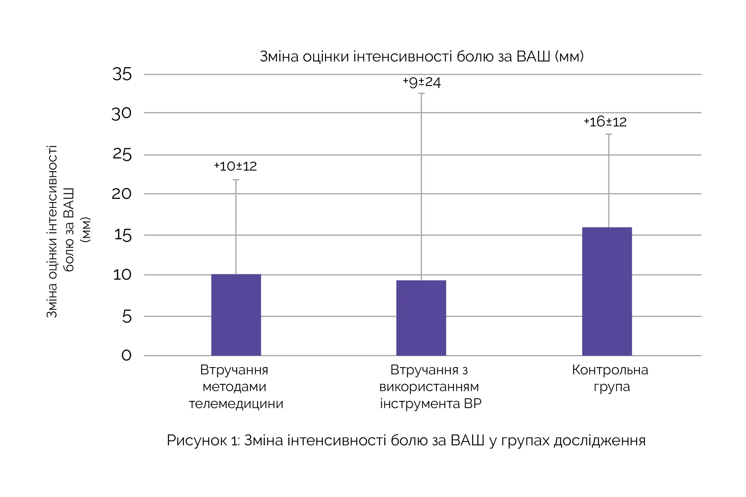 Після проведення одного сеансу фізичних вправ з використанням інструменту ВР та телемедицини, а також у контрольній групі оцінки інтенсивності болю у учасниць дослідження статистично не розрізнялися. Проте в оцінці взаємодії «група – час» було встановлено ефект від середньої до високої виразності. Це вказує на більш значну зміну оцінки інтенсивності болю після проведення одного сеансу фізичних вправ з використанням інструменту ВР (∆ (до та після сеансу): +9 ± 24 мм) та методами телемедицини (∆ (до та після сеансу): +10 ± 12 мм) порівняно з контрольною групою (∆ (до та після проведення сеансу): +16 ± 12 мм).