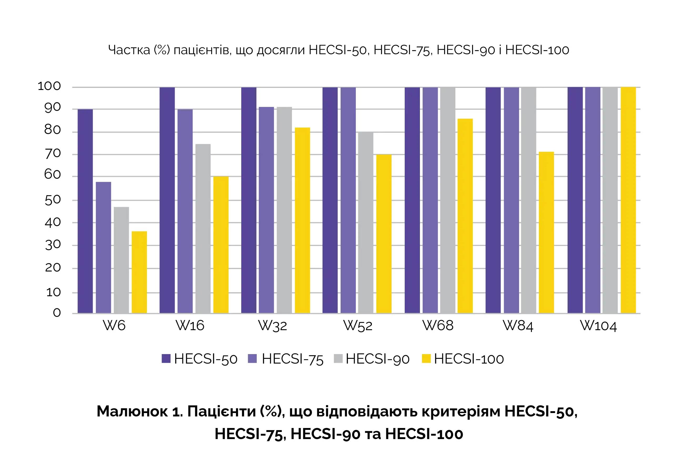 Загалом у 21 включених пацієнтів з дерматитом рук застосування дупілумабу до 16-го тижня призвело до того, що критерії HECSI-75 були досягнуті у 90% пацієнтів, а до 104-го тижня цей показник зріс до 100% (докладні дані наведено на малюнку 1). Більшість пацієнтів досягли критеріїв HECSI-90 та HECSI-100, що вказує на майже повне усунення симптомів.