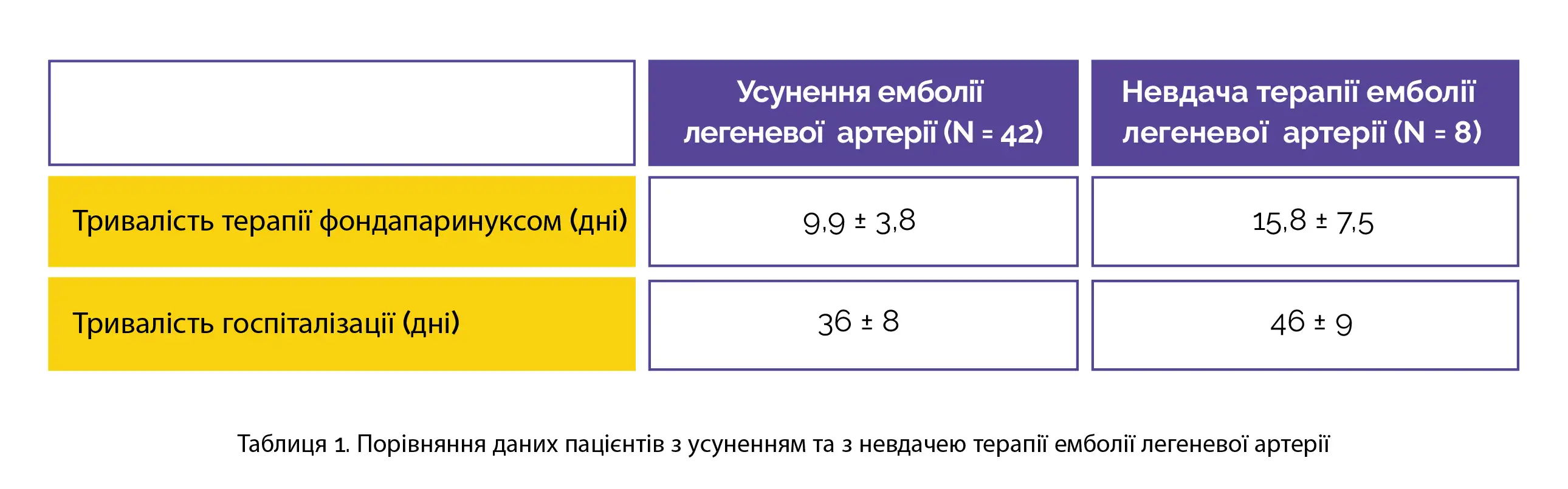 Усього було вивчено дані 50 пацієнтів. Середня тривалість наступного спостереження становила 42,5±10 днів. Відмінностей у вихідних характеристиках між пацієнтами з ГРДС (30%) та пацієнтами без ГРДС на момент госпіталізації не було виявлено. Пацієнти з усуненням емболії легеневої артерії (84%) були молодшими, а тривалість терапії фондапаринуксом та термін госпіталізації у них були коротшими порівняно з пацієнтами, у яких не вдалося усунути емболію легеневої артерії (див. таблицю 1).