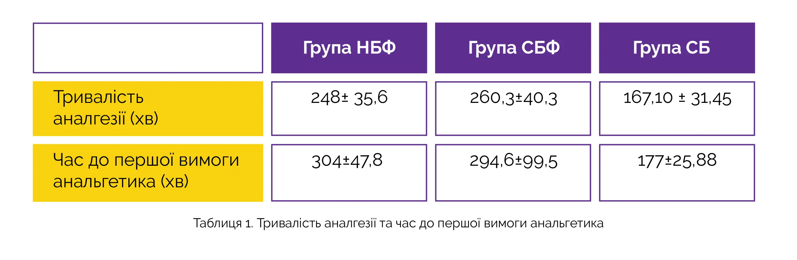 Тривалість аналгезії та час до першої вимоги анальгетика у групах НБФ та СБФ статистично значуще перевищували відповідні показники у групі СБ (див. таблицю 1).