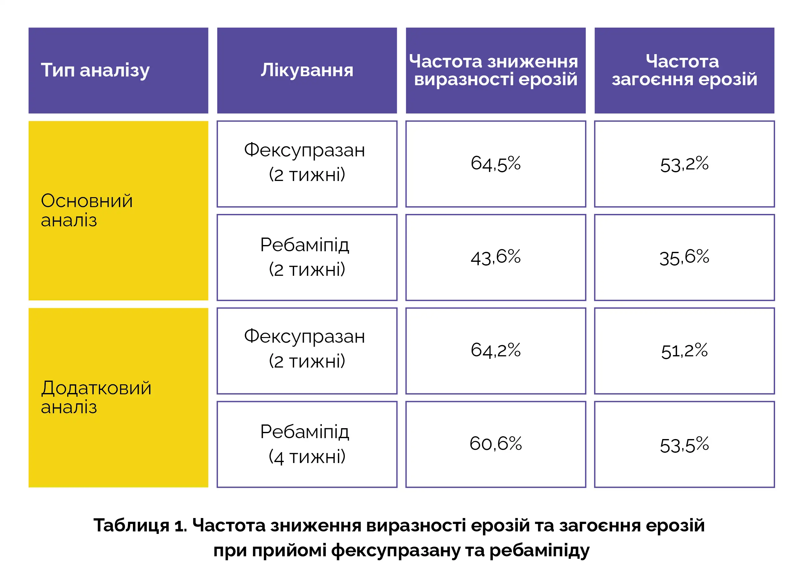 Дослідники оцінювали частоту зниження виразності ерозій та загоєння ерозій після двох тижнів прийому фексупразану порівняно з двома або чотирма тижнями прийому ребаміпіду, розрахувавши різницю ризиків та довірчі інтервали для ефектів лікування. За результатами основного аналізу частоти зниження виразності ерозій та загоєння ерозій встановлено вищу ефективність фексупразану порівняно з ребаміпідом. За даними додаткового аналізу, результати після двох тижнів лікування фексупразаном аналогічні результатам після чотирьох тижнів лікування ребаміпідом (таблиця 1).