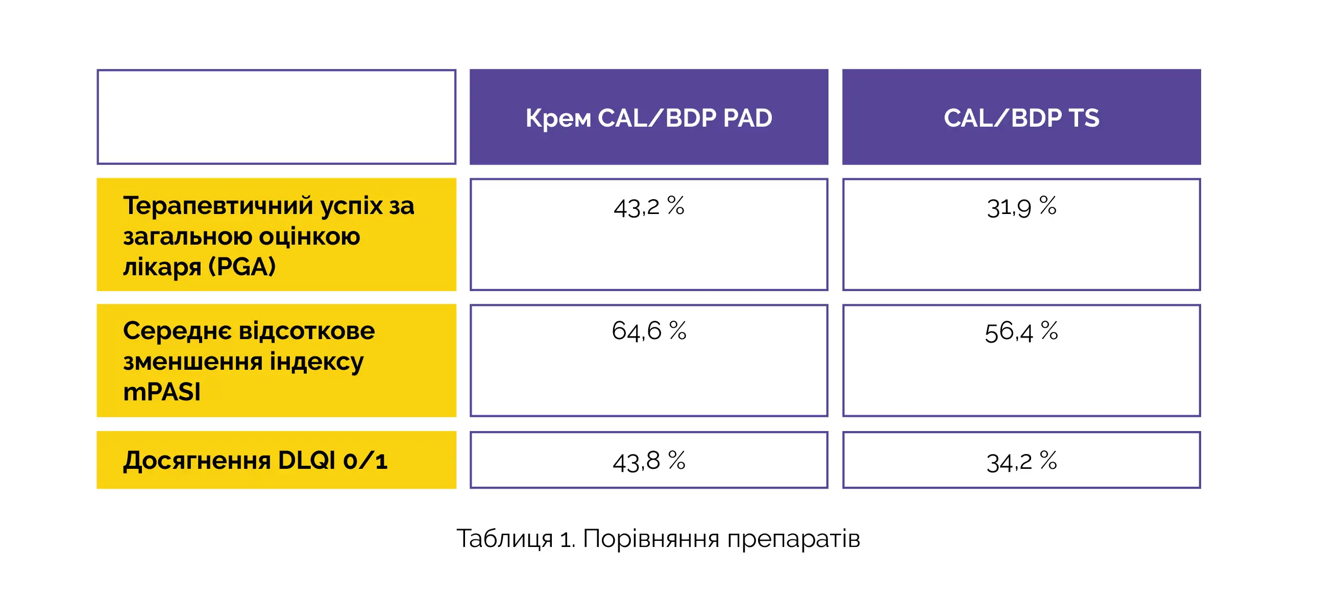 Було проведено порівняння крему CAL/BDP PAD та CAL/BDP TS за такими показниками, як якість життя пацієнтів, безпека та ефективність застосування. Новий крем CAL/BDP PAD продемонстрував високу ефективність та безпеку щодо зниження виразності псоріазу через 8 тижнів лікування. У порівнянні з CAL/BDP TS лікування кремом CAL/BDP PAD забезпечило більш високу частоту терапевтичного успіху за загальною оцінкою лікаря (PGA), більш високе середнє відсоткове зменшення модифікованого індексу площі ураження та тяжкості псоріазу (mPASI) та вищу частоту досягнення індексу якості життя при захворюваннях шкіри (DLQI) 0/1 (див. таблицю 1).