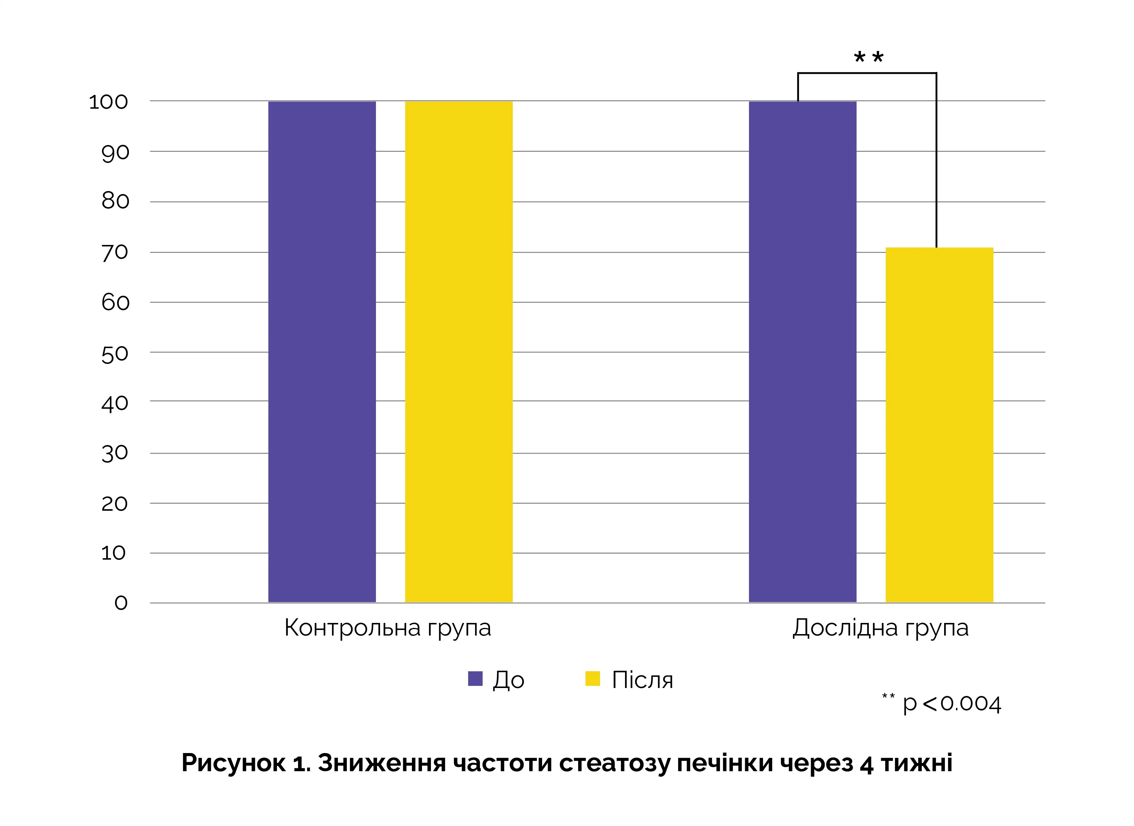 Зниження частоти стеатозу печінки після 4 тижнів вживання цілісних апельсинів склало 30 % (p < 0,004), тобто стеатоз печінки спостерігався лише у 70,9 % учасників групи вживання апельсинів порівняно зі 100 % у контрольній групі (рисунок 1).