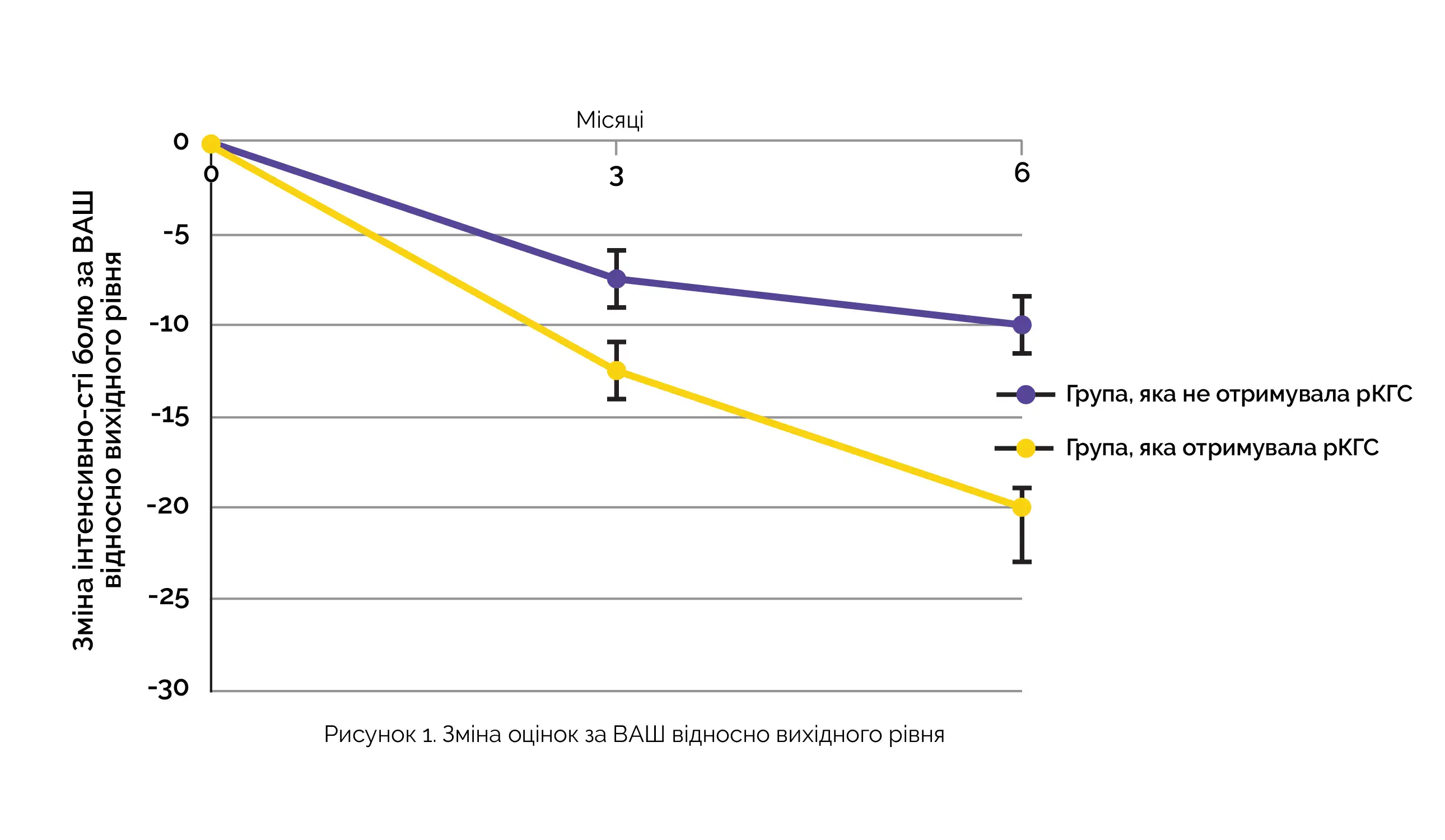 Обстеження пацієнтів проводили на початковому рівні, а потім через 3 та 6 місяців. До цього дослідження загалом було включено 123 учасники, з яких 67 отримували рКГС на додаток до стандартного лікування (група рКГС), а 56 — лише стандартне лікування (контрольна група). Основними кінцевими точками були зміни оцінок за візуальною аналоговою шкалою (ВАШ) та значень функціонального індексу при остеоартрозі суглобів кисті (Functional Index for Hand Osteoarthritis, FIHOA) через 6 місяців відносно вихідного рівня. Протягом півроку було відзначено статистично значущу зміну оцінок ВАШ (див. рис. 1) і значень індексу FIHOA на користь групи рКГС.