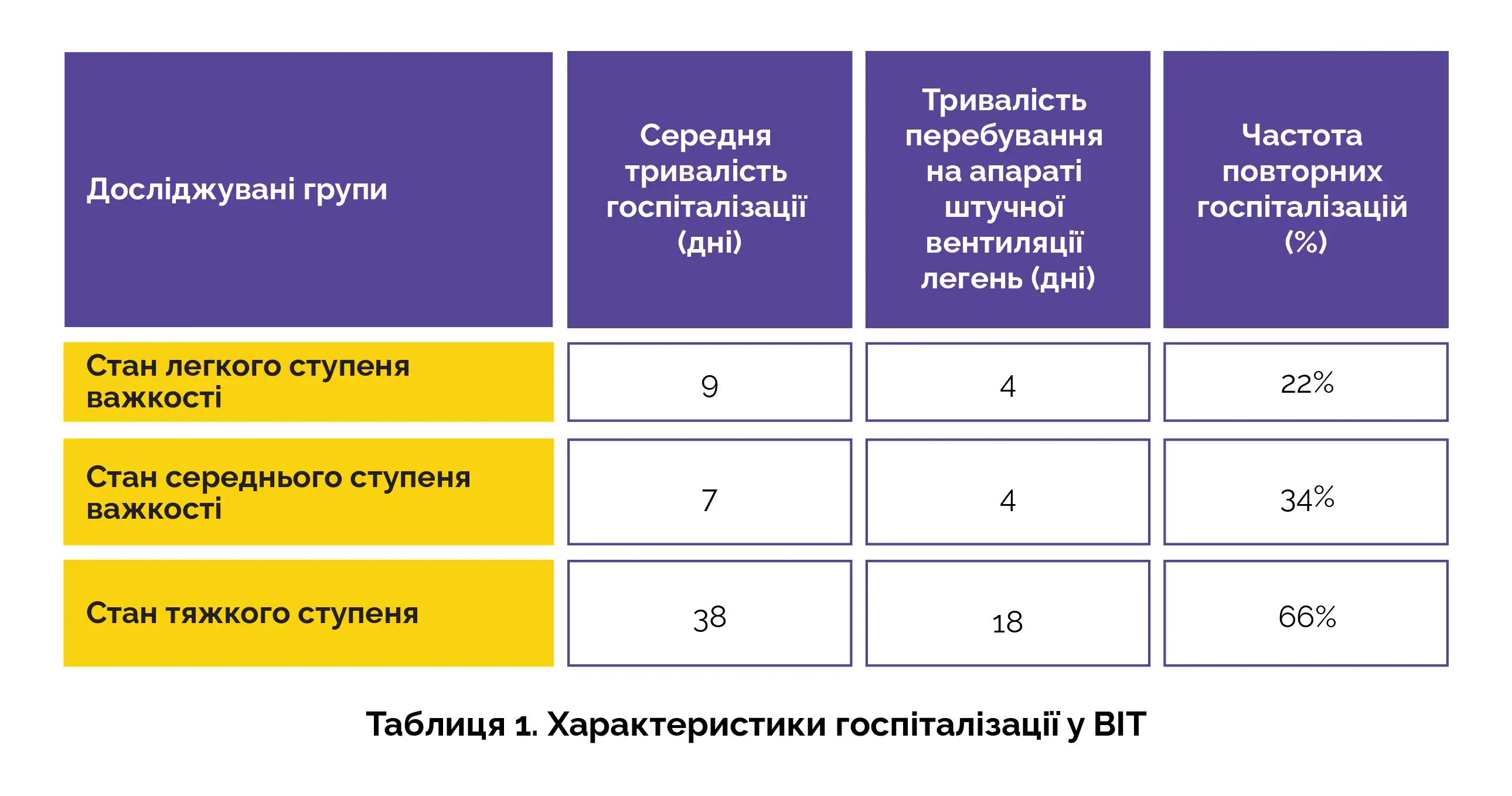 У цьому дослідженні стан 54 батьків оцінювався як легкого ступеня тяжкості (42 %), 68 батьків – середнього ступеня тяжкості (53 %), 6 батьків – тяжкого ступеня (4 %). Батьки зі станом легкого та середнього ступеня тяжкості, як правило, поверталися до вихідного стану через три місяці, тоді як у батьків у стані тяжкого ступеня спостерігалися менш сприятливі результати та порушення зберігалися через шість місяців після виписки дитини з ВІТ. Відомості про перебування в ВІТ для різних груп наведено нижче в таблиці 1.
