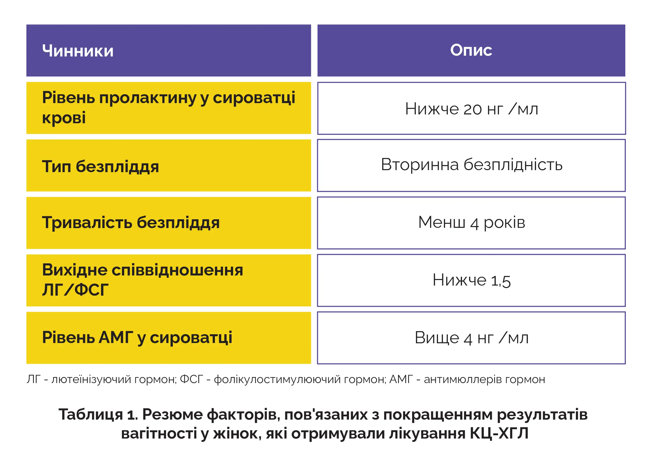 У жінок групи КЦ-ХГЧ спостерігалася значно вища частота настання клінічної вагітності (7,2 %) проти 2,3 % в іншій групі. У таблиці 1 представлені фактори, пов'язані з більшою ймовірністю досягнення вагітності у групі КЦ-ХГЛ (після модифікації з урахуванням індексу маси тіла та віку).